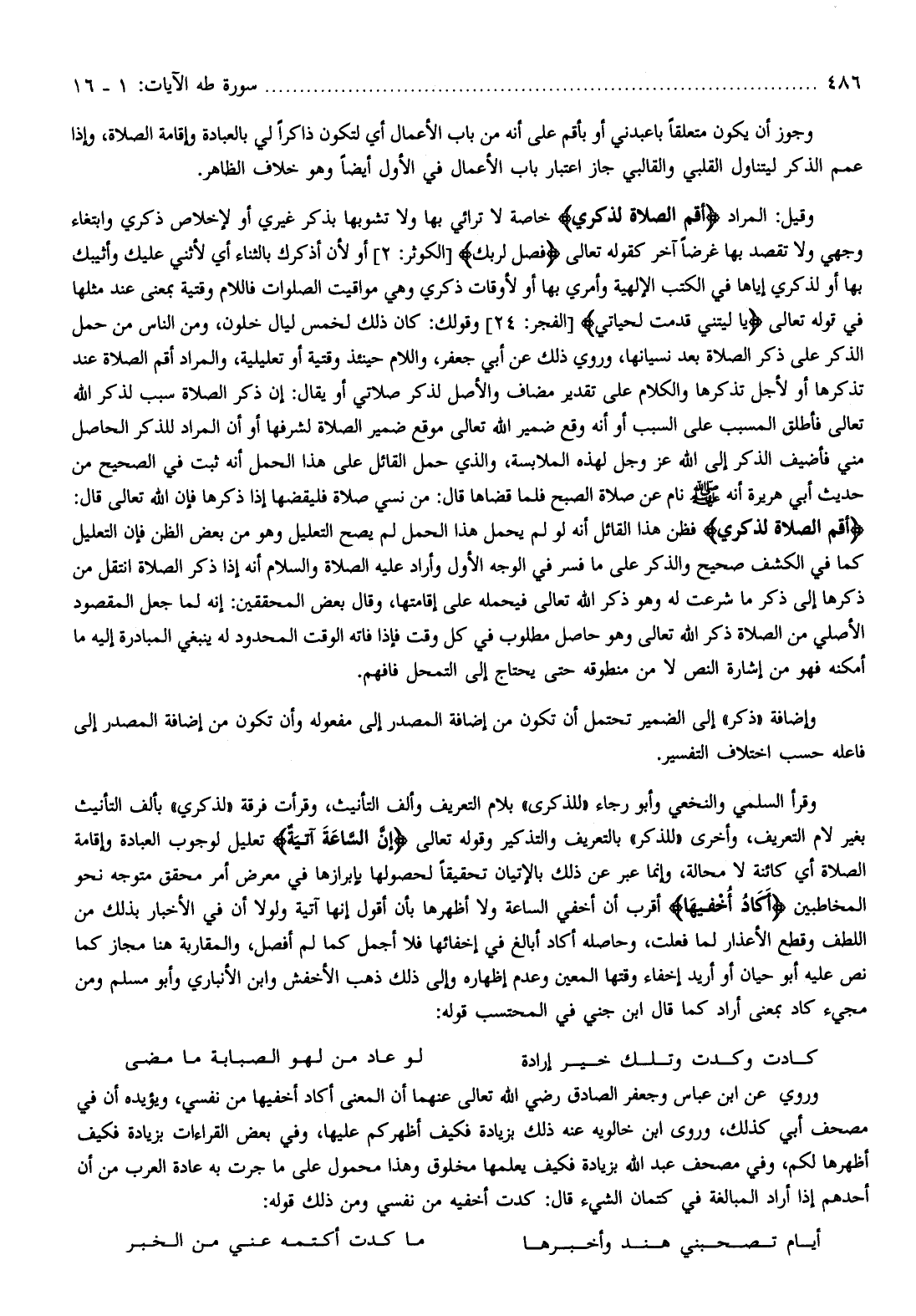 وقرأ السلمي والنخعي وأبو رجاء «للذكرى» بلام التعريف وألف التأنيث، وقرأت فرقة «لذكري» بألف التأنيث بغير لام التعريف، وأخرى «للذكر» بالتعريف والتذكير وقوله تعالى إِنَّ السَّاعَةَ آتِيَةٌ تعليل لوجوب العبادة وإقامة الصلاة أي كائنة لا محالة، وإنما عبر عن ذلك بالإتيان تحقيقا لحصولها بإبرازها في معرض أمر محقق متوجه نحو المخاطبين أَكادُ أُخْفِيها أقرب أن أخفي الساعة ولا أظهرها بأن أقول إنها آتية ولولا أن في الأخبار بذلك من اللطف وقطع الأعذار لما فعلت، وحاصله أكاد أبالغ في إخفائها فلا أجمل كما لم أفصل، والمقاربة هنا مجاز كما نص عليه أبو حيان أو أريد إخفاء وقتها المعين وعدم إظهاره وإلى ذلك ذهب الأخفش وابن الأنباري وأبو مسلم ومن مجيء كاد بمعنى أراد كما قال ابن جني في المحتسب قوله: