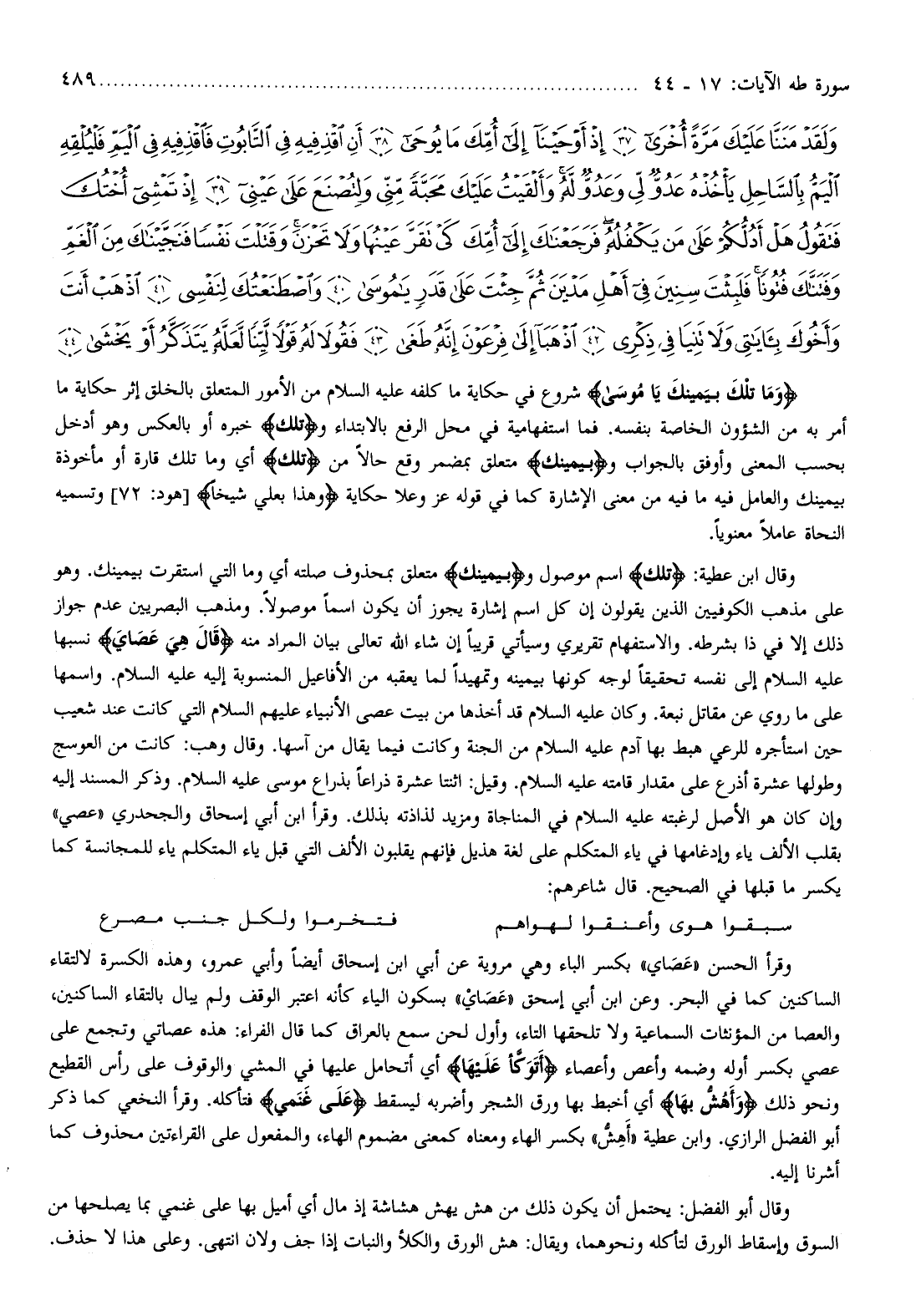 وقرأ الحسن «عصاي» بكسر الباء وهي مروية عن أبي ابن إسحاق أيضا وأبي عمرو، وهذه الكسرة لالتقاء الساكنين كما في البحر. وعن ابن أبي إسحق «عصاي» بسكون الياء كأنه اعتبر الوقف ولم يبال بالتقاء الساكنين، والعصا من المؤنثات السماعية ولا تلحقها التاء، وأول لحن سمع بالعراق كما قال الفراء: هذه عصاتي وتجمع على عصي بكسر أوله وضمه وأعص وأعصاء أَتَوَكَّؤُا عَلَيْها أي أتحامل عليها في المشي والوقوف على رأس القطيع ونحو ذلك وَأَهُشُّ بِها أي أخبط بها ورق الشجر وأضربه ليسقط عَلى غَنَمِي فتأكله. وقرأ النخعي كما ذكر أبو الفضل الرازي. وابن عطية «أهشّ» بكسر الهاء ومعناه كمعنى مضموم الهاء، والمفعول على القراءتين محذوف كما أشرنا إليه.