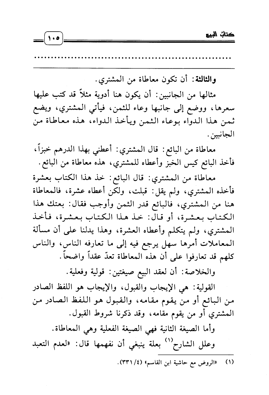 معاطاة من المشتري: قال البائع: خذ هذا الكتاب بعشرة فأخذه المشتري، ولم يقل: قبلت، ولكن أعطاه عشرة، فالمعاطاة هنا من المشتري، فالبائع قدر الثمن وأوجب فقال: بعتك هذا الكتاب بعشرة، أو قال: خذ هذا الكتاب بعشرة، فأخذ المشتري، ولم يتكلم وأعطاه العشرة، وهذا يدلنا على أن مسألة المعاملات أمرها سهل يرجع فيه إلى ما تعارفه الناس، والناس كلهم قد تعارفوا على أن هذه المعاطاة تعدّ عقداً واضحاً.