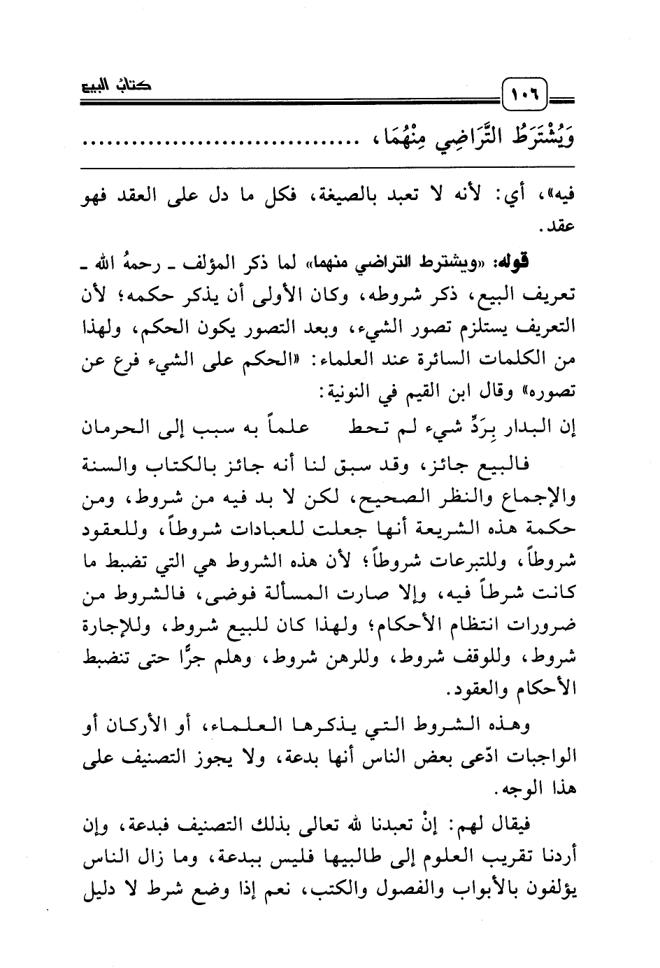 قوله: «ويشترط التراضي منهما» لما ذكر المؤلف ـ رحمه الله ـ تعريف البيع، ذكر شروطه، وكان الأولى أن يذكر حكمه؛ لأن التعريف يستلزم تصور الشيء، وبعد التصور يكون الحكم، ولهذا من الكلمات السائرة عند العلماء: «الحكم على الشيء فرع عن تصوره» وقال ابن القيم في النونية: