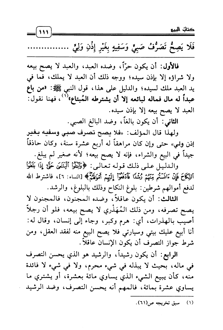 ولهذا قال المؤلف: «فلا يصح تصرف صبي وسفيه بغير إذن ولي» حتى وإن كان مراهقاً له أربع عشرة سنة، وكان حاذقاً جيداً في البيع والشراء، فإنه لا يصح بيعه؛ لأنه صغير لم يبلغ.