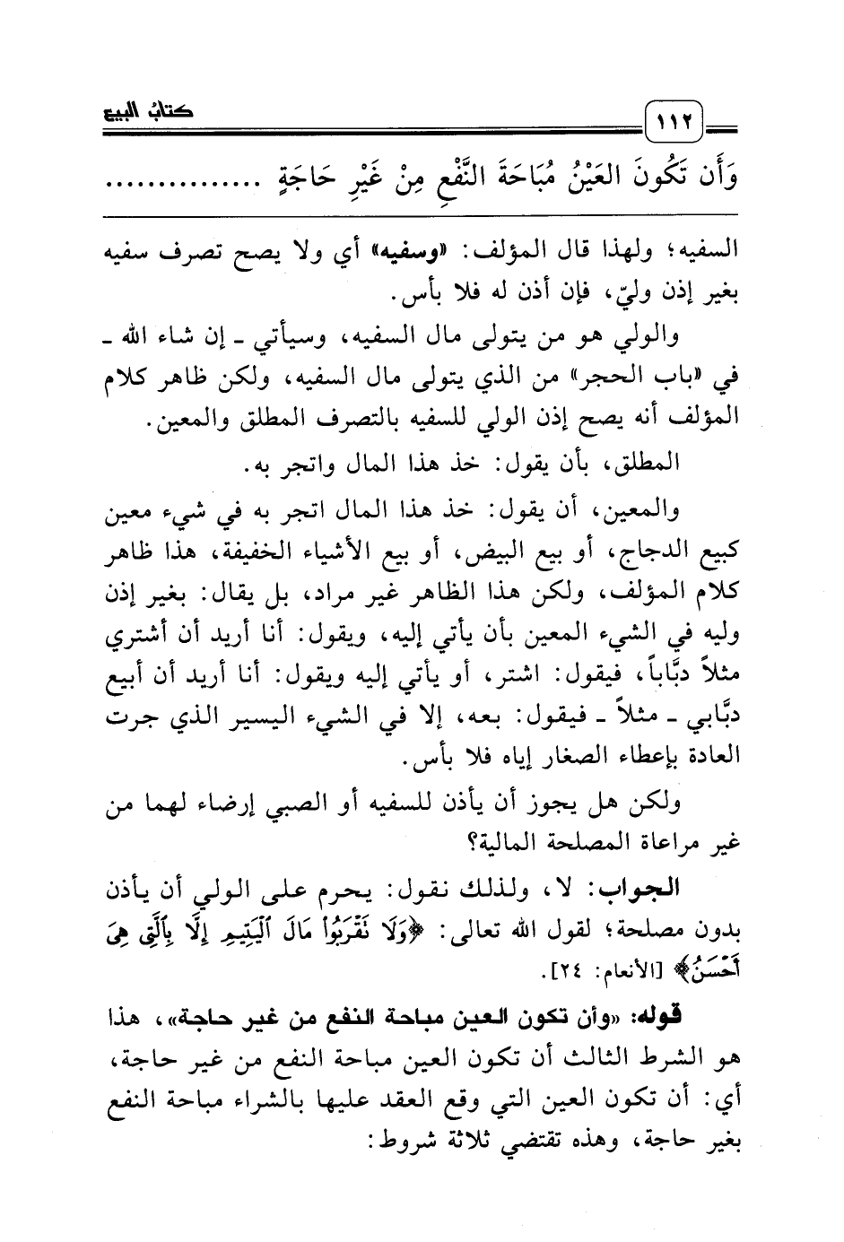 وأن تَكُونَ العَيْنُ مُبَاحَةَ النَّفْعِ مِنْ غَيْرِ حَاجَةٍ كَالبَغْلِ وَالحِمَارِ وَدُودِ القَزِّ وَبَزْرِهِ وَالفِيْلِ وَسِبَاع البَهَائِمِ الَّتِي تَصْلُحُ لِلصَّيْدِ إِلاَّ الكَلْبَ وَالحَشَرَاتِ وَالمُصْحَفَ وَالمَيْتَةَ وَالسَّرْجِينَ النَّجسَ، ..