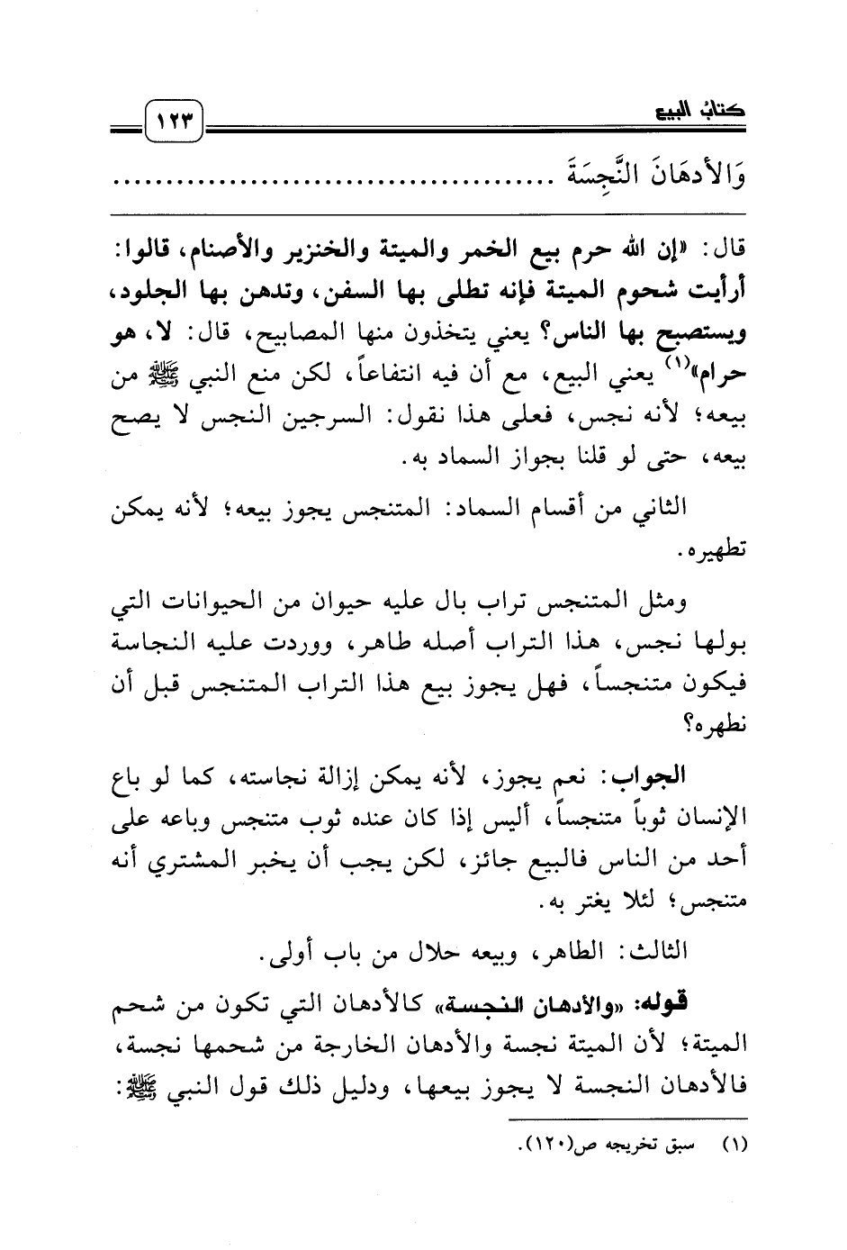 قوله: «والأدهان النجسة» كالأدهان التي تكون من شحم الميتة؛ لأن الميتة نجسة والأدهان الخارجة من شحمها نجسة، فالأدهان النجسة لا يجوز بيعها، ودليل ذلك قول النبي صلّى الله عليه وسلّم: