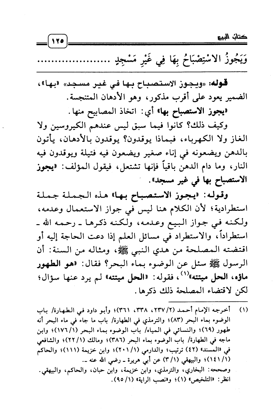 وقوله: «يجوز الاستصباح بها» هذه الجملة جملة استطرادية؛ لأن الكلام هنا ليس في جواز الاستعمال وعدمه، ولكنه في جواز البيع وعدمه، ولكنه ذكرها ـ رحمه الله ـ استطراداً، والاستطراد في مسائل العلم إذا دعت الحاجة إليه أو اقتضته المصلحة من هدي النبي صلّى الله عليه وسلّم، ومثاله من السنة: أن الرسول صلّى الله عليه وسلّم سئل عن الوضوء بماء البحر؟ فقال: «هو الطهور ماؤه، الحل ميتته» (¬1)، فقوله: «الحل ميتته» لم يرد عنها سؤال؛ لكن لاقتضاء المصلحة ذلك ذكرها.