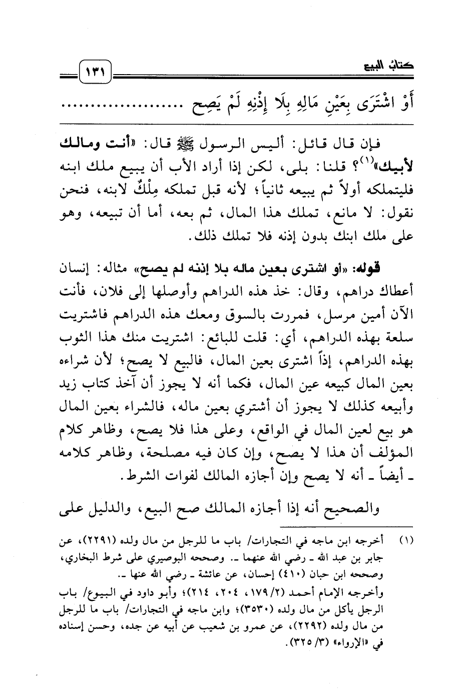 (¬1) أخرجه ابن ماجه في التجارات/ باب ما للرجل من مال ولده (2291)، عن جابر بن عبد الله ـ رضي الله عنهما ـ. وصححه البوصيري على شرط البخاري، وصححه ابن حبان (410) إحسان، عن عائشة ـ رضي الله عنها ـ.