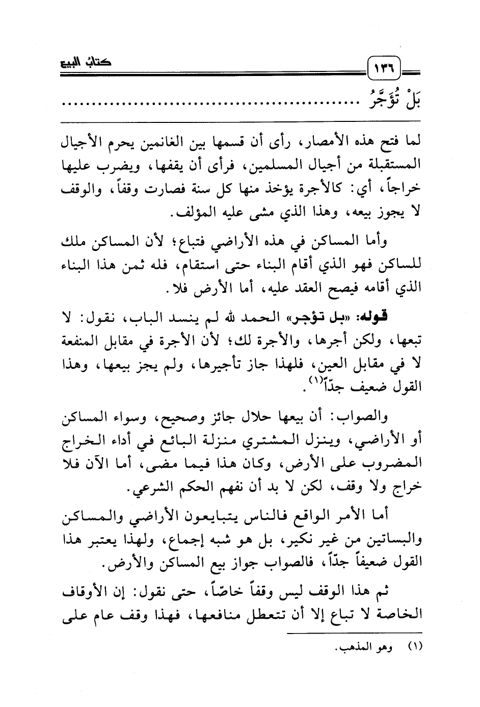 أما الأمر الواقع فالناس يتبايعون الأراضي والمساكن والبساتين من غير نكير، بل هو شبه إجماع، ولهذا يعتبر هذا القول ضعيفاً جدّاً، فالصواب جواز بيع المساكن والأرض.