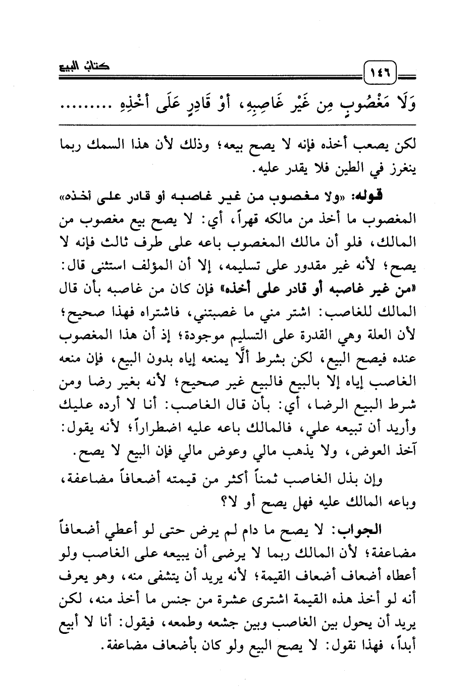 قوله: «ولا مغصوب من غير غاصبه أو قادر على أخذه» المغصوب ما أخذ من مالكه قهراً، أي: لا يصح بيع مغصوب من المالك، فلو أن مالك المغصوب باعه على طرف ثالث فإنه لا يصح؛ لأنه غير مقدور على تسليمه، إلا أن المؤلف استثنى قال: «من غير غاصبه أو قادر على أخذه» فإن كان من غاصبه بأن قال المالك للغاصب: اشتر مني ما غصبتني، فاشتراه فهذا صحيح؛ لأن العلة وهي القدرة على التسليم موجودة؛ إذ أن هذا المغصوب عنده فيصح البيع، لكن بشرط ألاَّ يمنعه إياه بدون البيع، فإن منعه الغاصب إياه إلا بالبيع فالبيع غير صحيح؛ لأنه بغير رضا ومن شرط البيع الرضا، أي: بأن قال الغاصب: أنا لا أرده عليك وأريد أن تبيعه علي، فالمالك باعه عليه اضطراراً؛ لأنه يقول: آخذ العوض، ولا يذهب مالي وعوض مالي فإن البيع لا يصح.