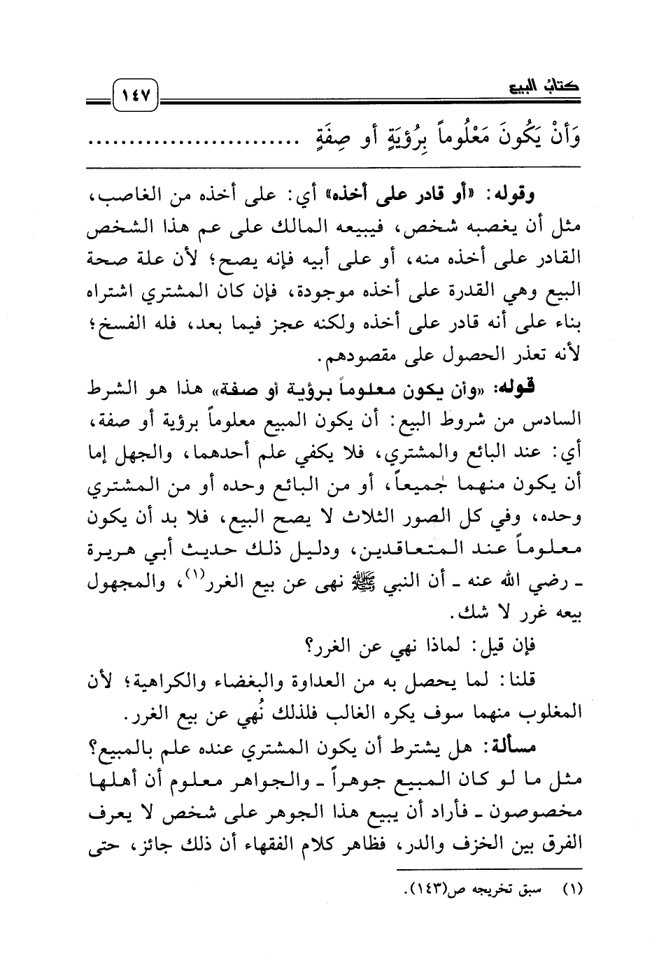 قوله: «وأن يكون معلوماً برؤية أو صفة» هذا هو الشرط السادس من شروط البيع: أن يكون المبيع معلوماً برؤية أو صفة، أي: عند البائع والمشتري، فلا يكفي علم أحدهما، والجهل إما أن يكون منهما جميعاً، أو من البائع وحده أو من المشتري وحده، وفي كل الصور الثلاث لا يصح البيع، فلا بد أن يكون معلوماً عند المتعاقدين، ودليل ذلك حديث أبي هريرة ـ رضي الله عنه ـ أن النبي صلّى الله عليه وسلّم نهى عن بيع الغرر (¬1)، والمجهول بيعه غرر لا شك.