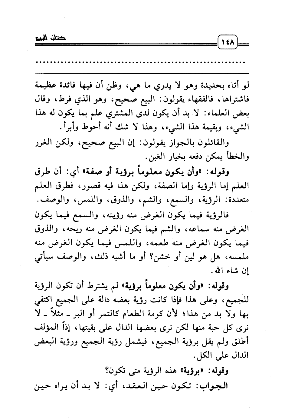 وقوله: «وأن يكون معلوماً برؤية أو صفة» أي: أن طرق العلم إما الرؤية وإما الصفة، ولكن هذا فيه قصور، فطرق العلم متعددة: الرؤية، والسمع، والشم، والذوق، واللمس، والوصف.