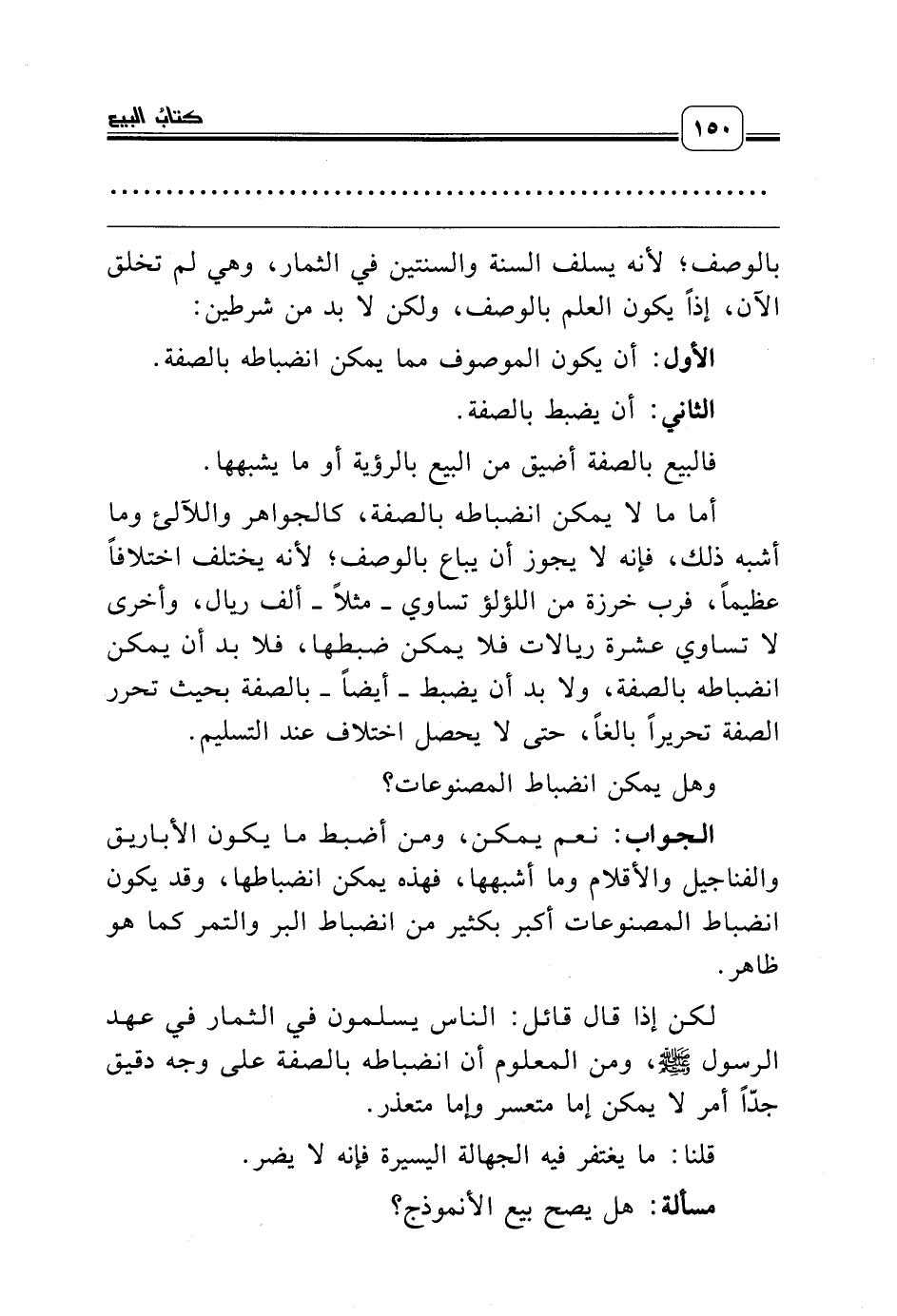 أما ما لا يمكن انضباطه بالصفة، كالجواهر واللآلئ وما أشبه ذلك، فإنه لا يجوز أن يباع بالوصف؛ لأنه يختلف اختلافاً عظيماً، فرب خرزة من اللؤلؤ تساوي ـ مثلاً ـ ألف ريال، وأخرى لا تساوي عشرة ريالات فلا يمكن ضبطها، فلا بد أن يمكن انضباطه بالصفة، ولا بد أن يضبط ـ أيضاً ـ بالصفة بحيث تحرر الصفة تحريراً بالغاً، حتى لا يحصل اختلاف عند التسليم.