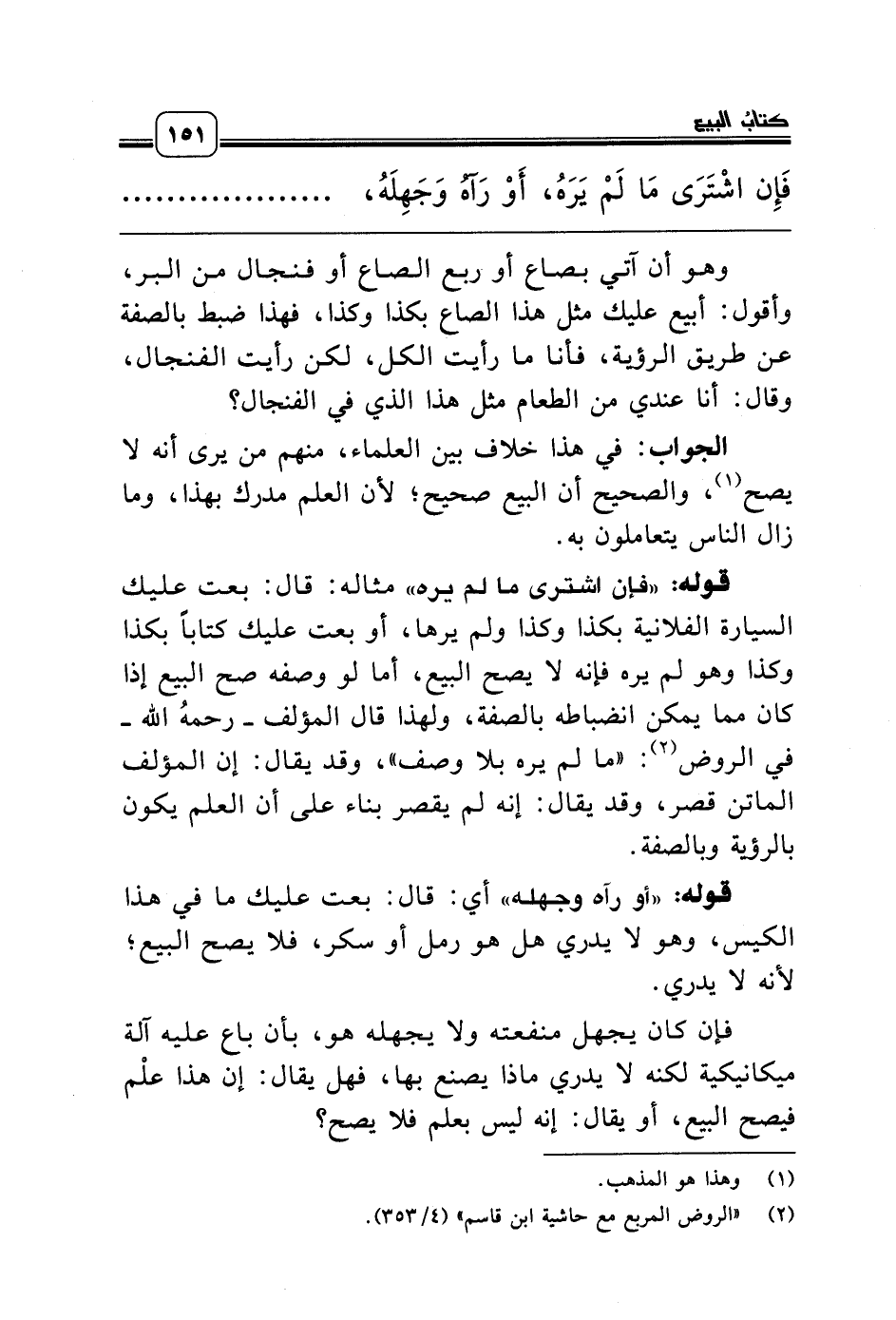 قوله: «فإن اشترى ما لم يره» مثاله: قال: بعت عليك السيارة الفلانية بكذا وكذا ولم يرها، أو بعت عليك كتاباً بكذا وكذا وهو لم يره فإنه لا يصح البيع، أما لو وصفه صح البيع إذا كان مما يمكن انضباطه بالصفة، ولهذا قال المؤلف ـ رحمه الله ـ في الروض (¬2): «ما لم يره بلا وصف»، وقد يقال: إن المؤلف الماتن قصر، وقد يقال: إنه لم يقصر بناء على أن العلم يكون بالرؤية وبالصفة.