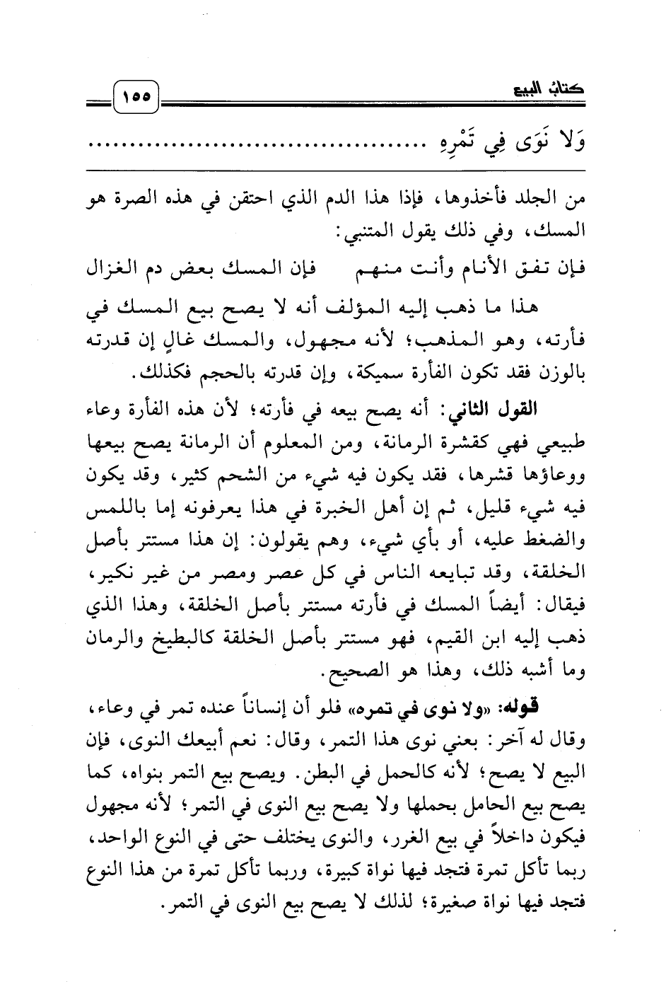 قوله: «ولا نوى في تمره» فلو أن إنساناً عنده تمر في وعاء، وقال له آخر: بعني نوى هذا التمر، وقال: نعم أبيعك النوى، فإن البيع لا يصح؛ لأنه كالحمل في البطن. ويصح بيع التمر بنواه، كما يصح بيع الحامل بحملها ولا يصح بيع النوى في التمر؛ لأنه مجهول فيكون داخلاً في بيع الغرر، والنوى يختلف حتى في النوع الواحد، ربما تأكل تمرة فتجد فيها نواة كبيرة، وربما تأكل تمرة من هذا النوع فتجد فيها نواة صغيرة؛ لذلك لا يصح بيع النوى في التمر.