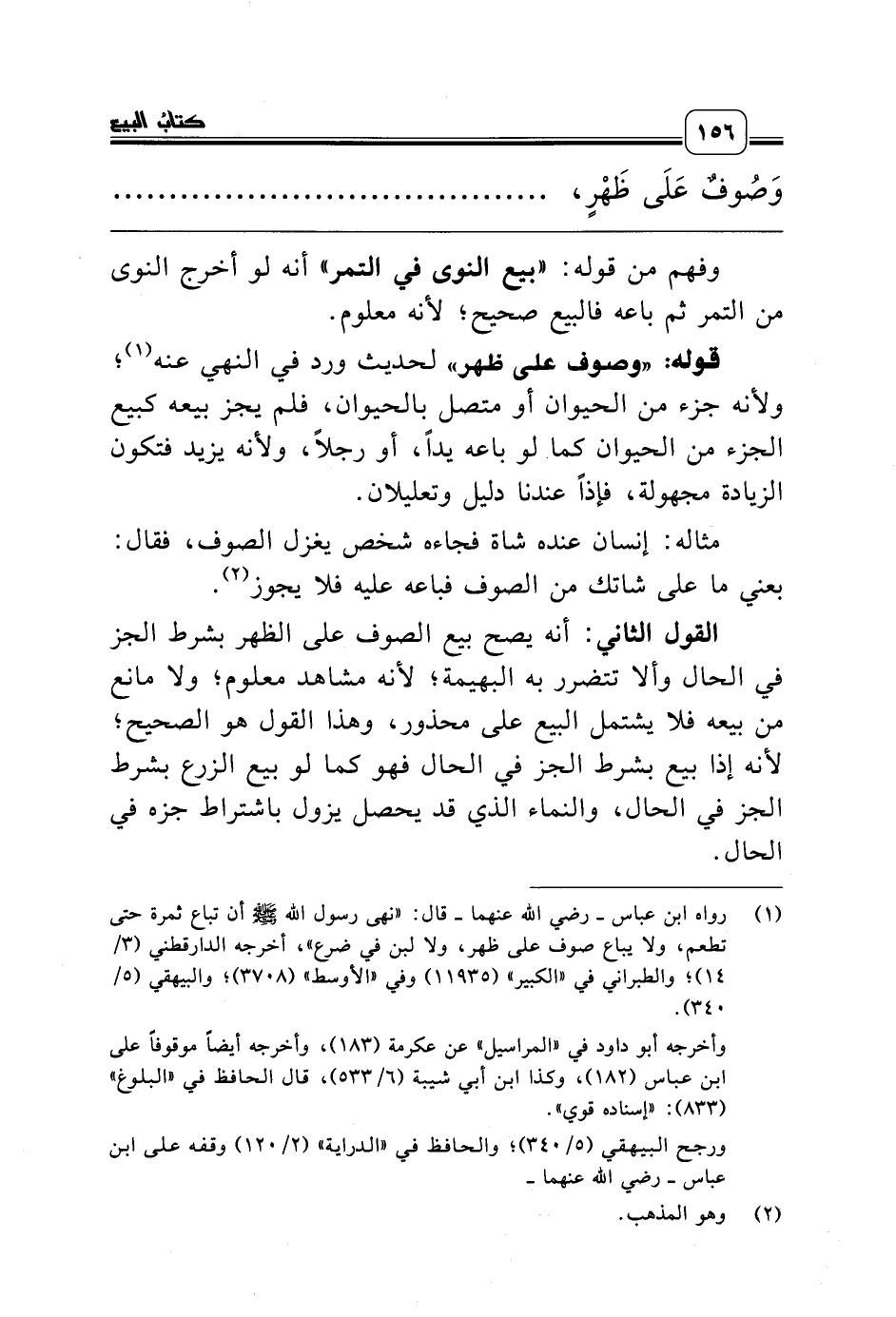 (¬1) رواه ابن عباس ـ رضي الله عنهما ـ قال: «نهى رسول الله صلّى الله عليه وسلّم أن تباع ثمرة حتى تطعم، ولا يباع صوف على ظهر، ولا لبن في ضرع»، أخرجه الدارقطني (3/ 14)؛ والطبراني في «الكبير» (11935) وفي «الأوسط» (3708)؛ والبيهقي (5/ 340).