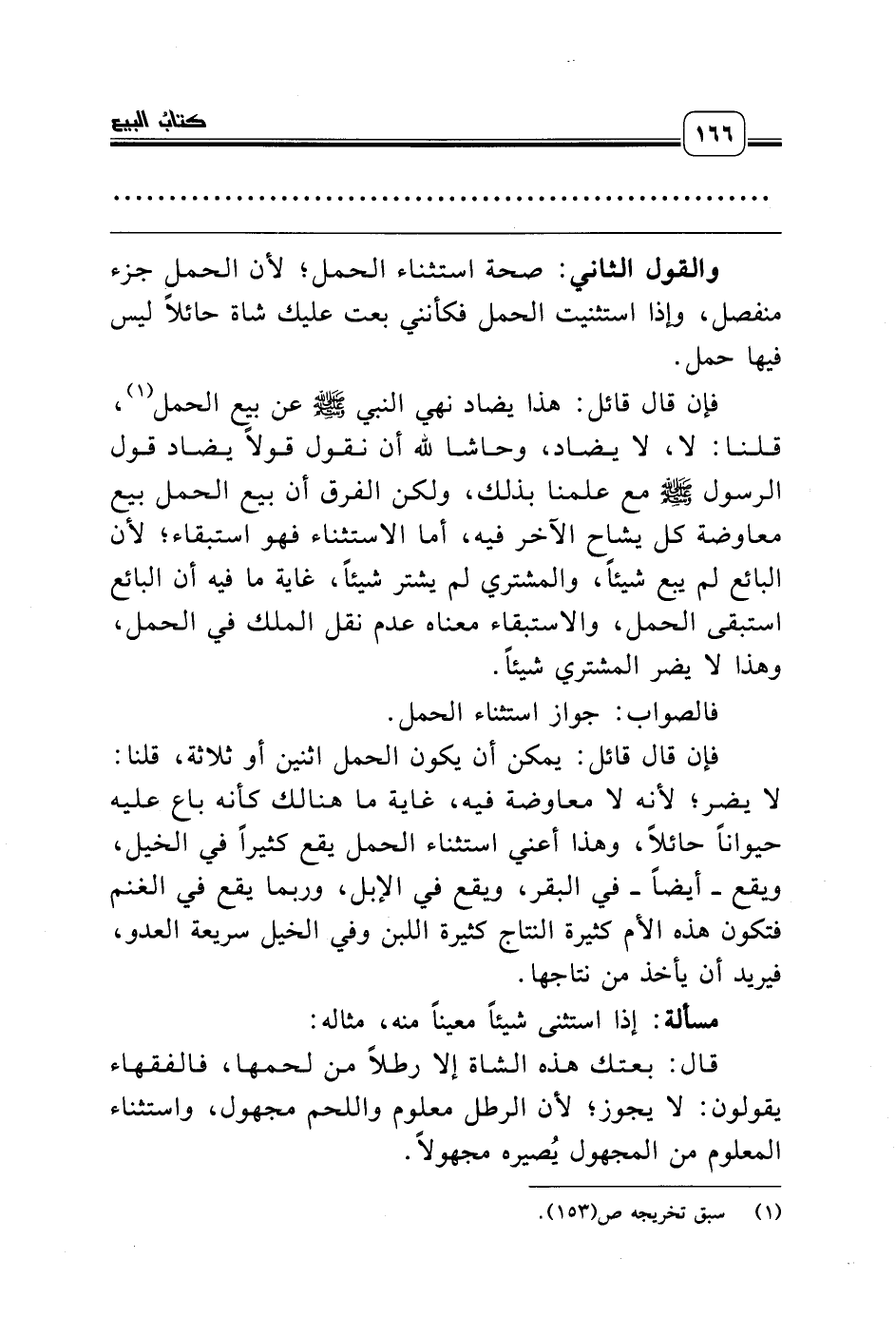 فإن قال قائل: هذا يضاد نهي النبي صلّى الله عليه وسلّم عن بيع الحمل (¬1)، قلنا: لا، لا يضاد، وحاشا لله أن نقول قولاً يضاد قول الرسول صلّى الله عليه وسلّم مع علمنا بذلك، ولكن الفرق أن بيع الحمل بيع معاوضة كل يشاح الآخر فيه، أما الاستثناء فهو استبقاء؛ لأن البائع لم يبع شيئاً، والمشتري لم يشتر شيئاً، غاية ما فيه أن البائع استبقى الحمل، والاستبقاء معناه عدم نقل الملك في الحمل، وهذا لا يضر المشتري شيئاً.