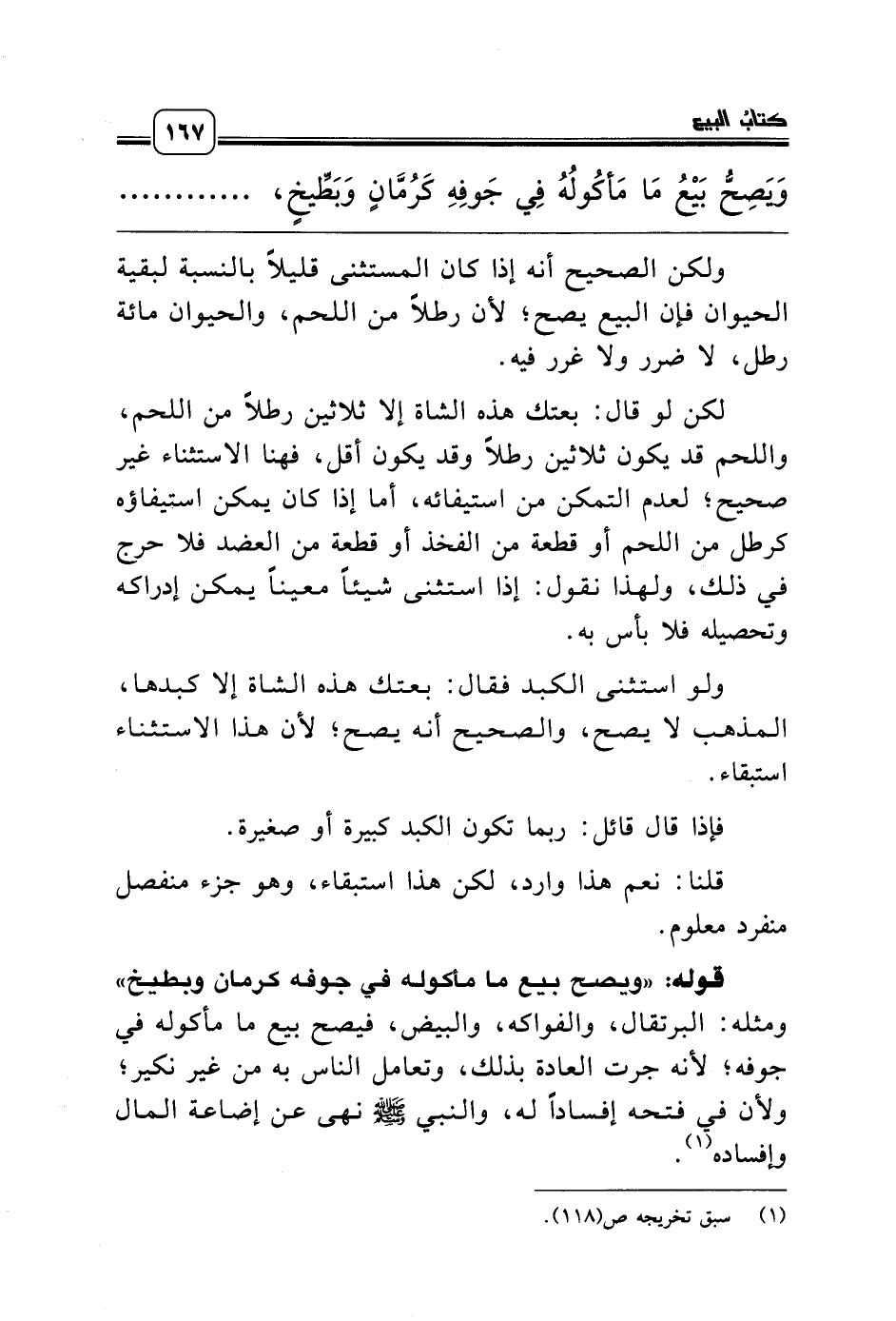 لكن لو قال: بعتك هذه الشاة إلا ثلاثين رطلاً من اللحم، واللحم قد يكون ثلاثين رطلاً وقد يكون أقل، فهنا الاستثناء غير صحيح؛ لعدم التمكن من استيفائه، أما إذا كان يمكن استيفاؤه كرطل من اللحم أو قطعة من الفخذ أو قطعة من العضد فلا حرج في ذلك، ولهذا نقول: إذا استثنى شيئاً معيناً يمكن إدراكه وتحصيله فلا بأس به.