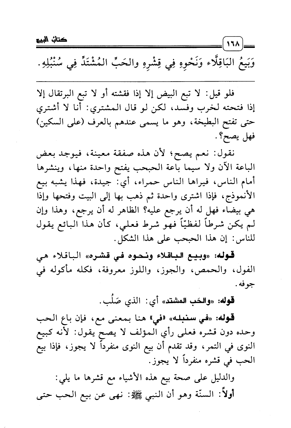 قوله: «وبيع الباقلاء ونحوه في قشره» الباقلاء هي الفول، والحمص، والجوز، واللوز معروفة، فكله مأكوله في جوفه.