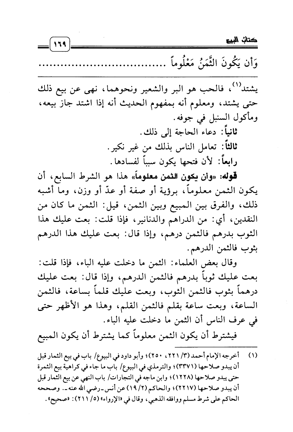 قوله: «وأن يكون الثمن معلوماً» هذا هو الشرط السابع، أن يكون الثمن معلوماً، برؤية أو صفة أو عدّ أو وزن، وما أشبه ذلك، والفرق بين المبيع وبين الثمن، قيل: الثمن ما كان من النقدين، أي: من الدراهم والدنانير، فإذا قلت: بعت عليك هذا الثوب بدرهم فالثمن درهم، وإذا قال: بعت عليك هذا الدرهم بثوب فالثمن الدرهم.