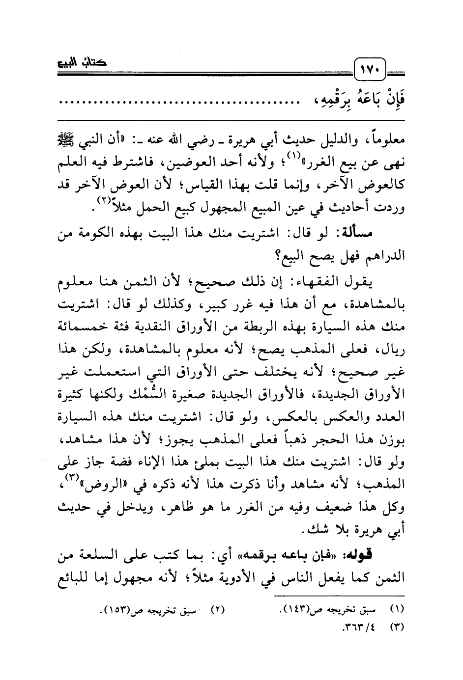يقول الفقهاء: إن ذلك صحيح؛ لأن الثمن هنا معلوم بالمشاهدة، مع أن هذا فيه غرر كبير، وكذلك لو قال: اشتريت منك هذه السيارة بهذه الربطة من الأوراق النقدية فئة خمسمائة ريال، فعلى المذهب يصح؛ لأنه معلوم بالمشاهدة، ولكن هذا غير صحيح؛ لأنه يختلف حتى الأوراق التي استعملت غير الأوراق الجديدة، فالأوراق الجديدة صغيرة السُّمْك ولكنها كثيرة العدد والعكس بالعكس، ولو قال: اشتريت منك هذه السيارة بوزن هذا الحجر ذهباً فعلى المذهب يجوز؛ لأن هذا مشاهد، ولو قال: اشتريت منك هذا البيت بملئ هذا الإناء فضة جاز على المذهب؛ لأنه مشاهد وأنا ذكرت هذا لأنه ذكره في «الروض» (¬3)، وكل هذا ضعيف وفيه من الغرر ما هو ظاهر، ويدخل في حديث أبي هريرة بلا شك.