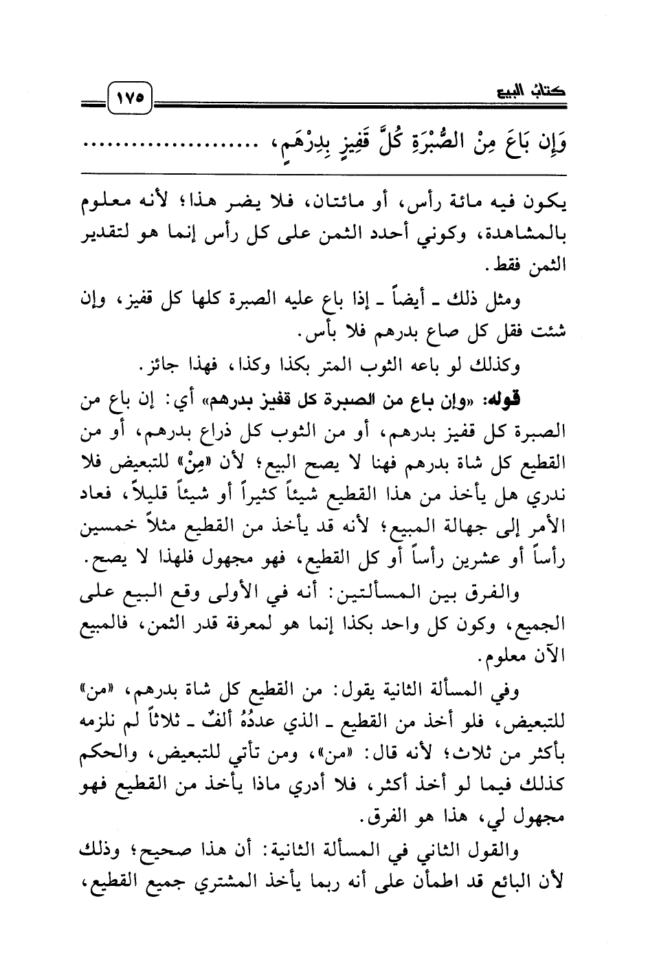 قوله: «وإن باع من الصبرة كل قفيز بدرهم» أي: إن باع من الصبرة كل قفيز بدرهم، أو من الثوب كل ذراع بدرهم، أو من القطيع كل شاة بدرهم فهنا لا يصح البيع؛ لأن «مِنْ» للتبعيض فلا ندري هل يأخذ من هذا القطيع شيئاً كثيراً أو شيئاً قليلاً، فعاد الأمر إلى جهالة المبيع؛ لأنه قد يأخذ من القطيع مثلاً خمسين رأساً أو عشرين رأساً أو كل القطيع، فهو مجهول فلهذا لا يصح.