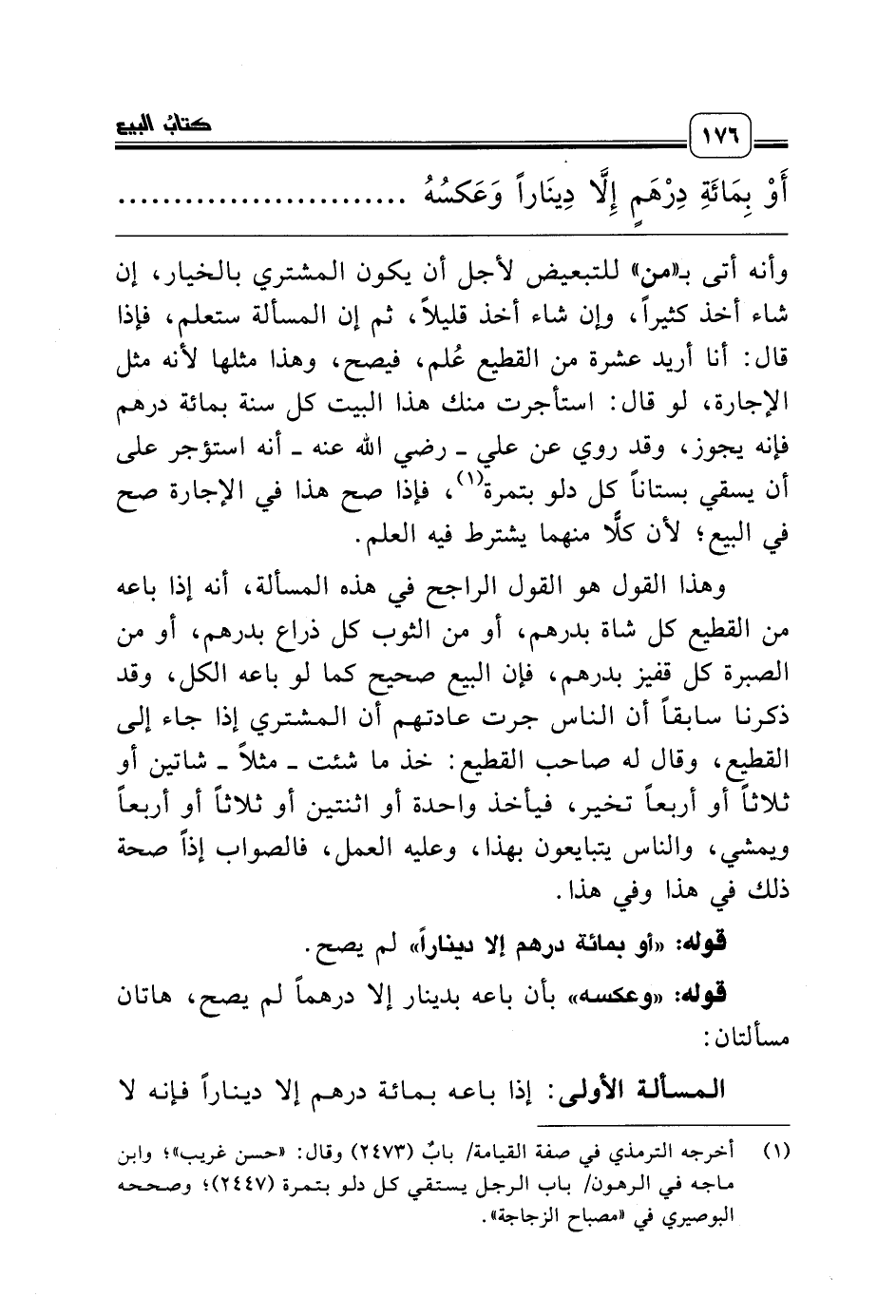 المسألة الأولى: إذا باعه بمائة درهم إلا ديناراً فإنه لا
