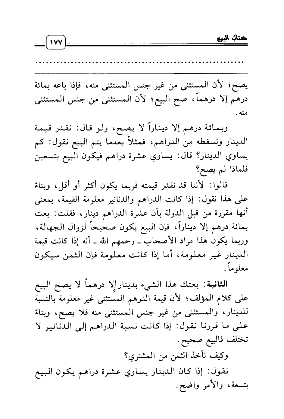 قالوا: لأننا قد نقدر قيمته فربما يكون أكثر أو أقل، وبناءً على هذا نقول: إذا كانت الدراهم والدنانير معلومة القيمة، بمعنى أنها مقررة من قبل الدولة بأن عشرة الدراهم دينار، فقلت: بعت بمائة درهم إلا ديناراً، فإن البيع يكون صحيحاً لزوال الجهالة، وربما يكون هذا مراد الأصحاب ـ رحمهم الله ـ أنه إذا كانت قيمة الدينار غير معلومة، أما إذا كانت معلومة فإن الثمن سيكون معلوماً.