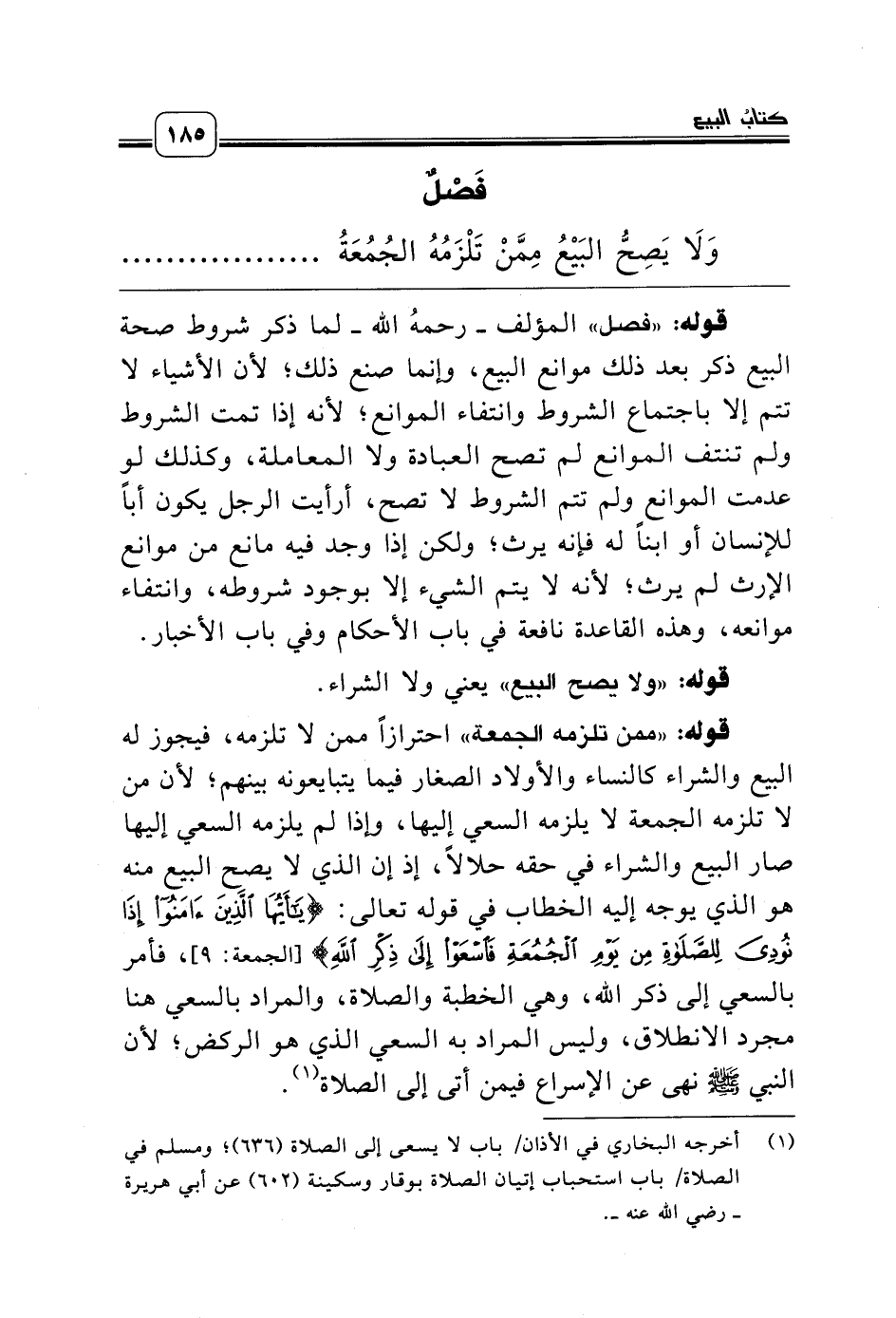 قوله: «ممن تلزمه الجمعة» احترازاً ممن لا تلزمه، فيجوز له البيع والشراء كالنساء والأولاد الصغار فيما يتبايعونه بينهم؛ لأن من لا تلزمه الجمعة لا يلزمه السعي إليها، وإذا لم يلزمه السعي إليها صار البيع والشراء في حقه حلالاً، إذ إن الذي لا يصح البيع منه هو الذي يوجه إليه الخطاب في قوله تعالى: {يَاأَيُّهَا الَّذِينَ آمَنُوا إِذَا نُودِيَ لِلصَّلاَةِ مِنْ يَوْمِ الْجُمُعَةِ فَاسْعَوْا إِلَى ذِكْرِ اللَّهِ} [الجمعة: 9]، فأمر بالسعي إلى ذكر الله، وهي الخطبة والصلاة، والمراد بالسعي هنا مجرد الانطلاق، وليس المراد به السعي الذي هو الركض؛ لأن النبي صلّى الله عليه وسلّم نهى عن الإسراع فيمن أتى إلى الصلاة (¬1).