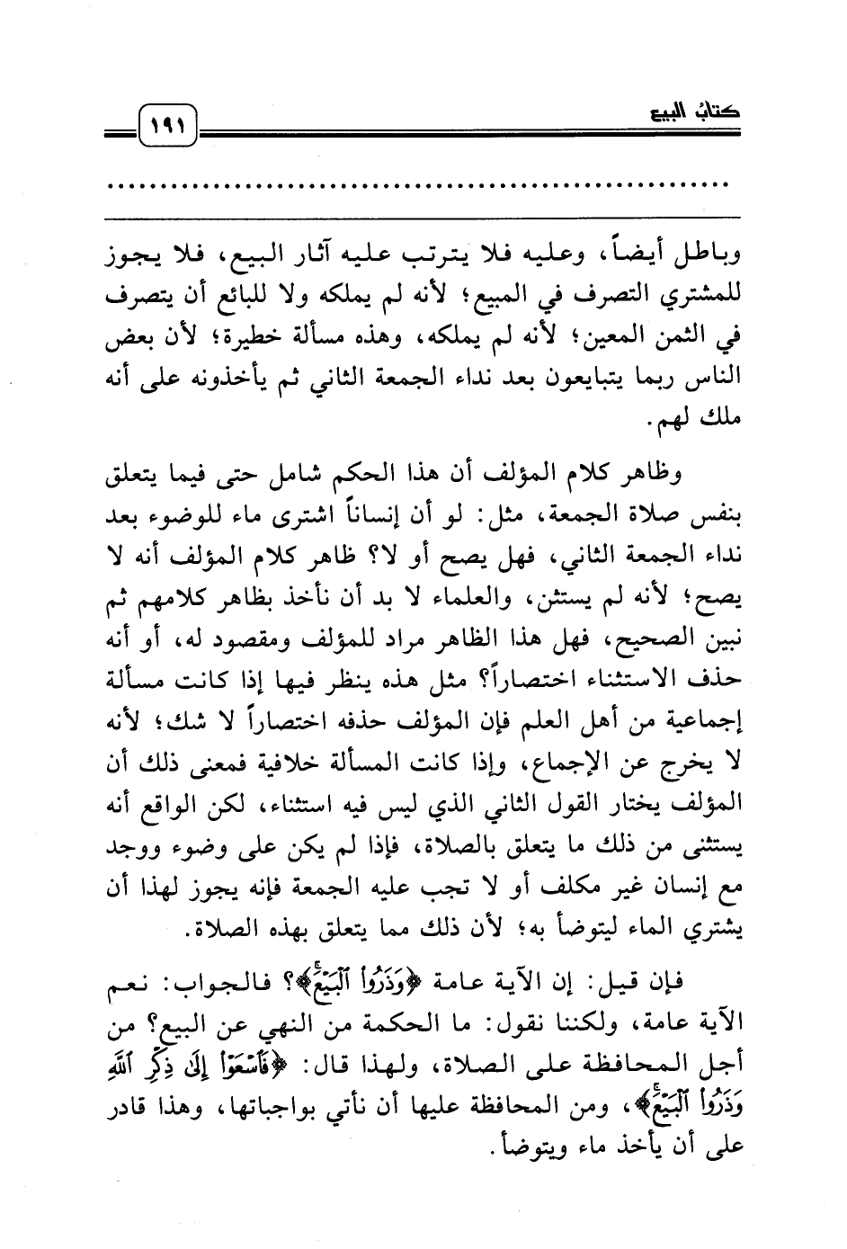 فإن قيل: إن الآية عامة {وَذَرُوا الْبَيْعَ}؟ فالجواب: نعم الآية عامة، ولكننا نقول: ما الحكمة من النهي عن البيع؟ من أجل المحافظة على الصلاة، ولهذا قال: {فَاسْعَوْا إِلَى ذِكْرِ اللَّهِ وَذَرُوا الْبَيْعَ}، ومن المحافظة عليها أن نأتي بواجباتها، وهذا قادر على أن يأخذ ماء ويتوضأ.