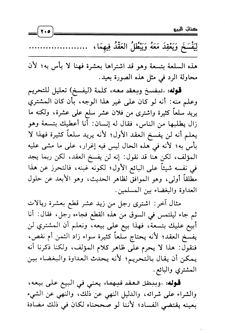 قوله: «ليفسخ ويعقد معه» كلمة (ليفسخ) تعليل للتحريم وعلم منه: أنه لو كان على غير هذا الوجه، بأن كان المشتري يريد سلعاً كثيرة واشترى من فلان عشر سلع على عشرة، ولكنه ما زال يطلبها من الناس، فقال له إنسان: أنا أعطيك بتسعة وهو يعلم أنه لن يفسخ العقد الأول؛ لأنه يريد سلعاً كثيرة فهذا لا بأس به؛ لأنه في هذه الحال ليس فيه إغرار، على ما مشى عليه المؤلف، لكن هنا قد نقول: إنه لن يفسخ العقد، لكن ربما يجد في نفسه شيئاً على البائع الأول؛ لكونه غبنه، فالتحرز عن هذا مطلقاً أولى، وهو الموافق لظاهر الحديث، وهو الأبعد عن حلول العداوة والبغضاء بين المسلمين.