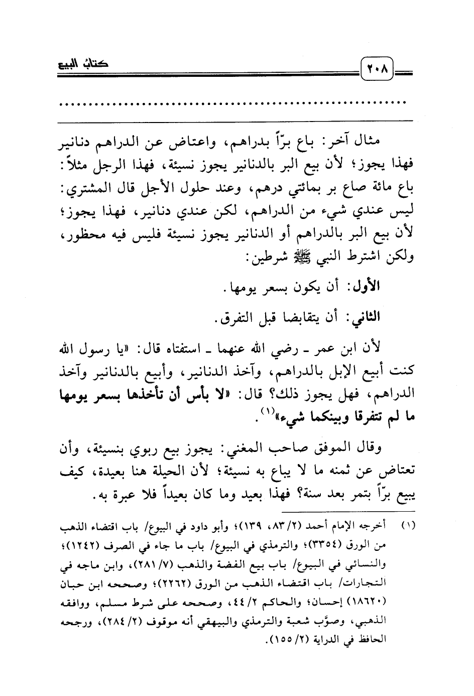 (¬1) أخرجه الإمام أحمد (2/ 83، 139)؛ وأبو داود في البيوع/ باب اقتضاء الذهب من الورق (3354)؛ والترمذي في البيوع/ باب ما جاء في الصرف (1242)؛ والنسائي في البيوع/ باب بيع الفضة والذهب (7/ 281)، وابن ماجه في التجارات/ باب اقتضاء الذهب من الورق (2262)؛ وصححه ابن حبان (18620) إحسان؛ والحاكم 2/ 44، وصححه على شرط مسلم، ووافقه الذهبي، وصوَّب شعبة والترمذي والبيهقي أنه موقوف (2/ 284)، ورجحه الحافظ في الدراية (2/ 155).