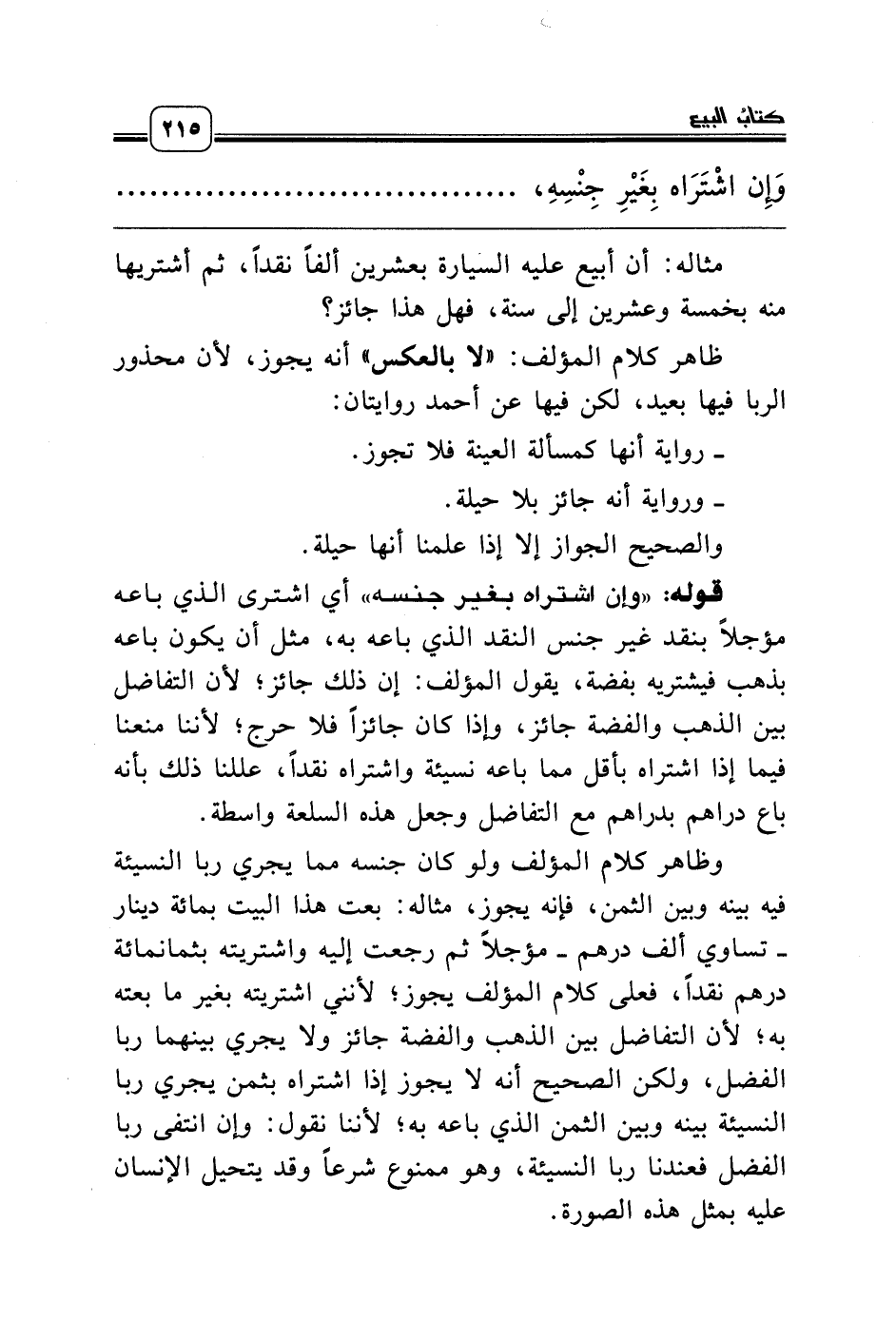 وظاهر كلام المؤلف ولو كان جنسه مما يجري ربا النسيئة فيه بينه وبين الثمن، فإنه يجوز، مثاله: بعت هذا البيت بمائة دينار ـ تساوي ألف درهم ـ مؤجلاً ثم رجعت إليه واشتريته بثمانمائة درهم نقداً، فعلى كلام المؤلف يجوز؛ لأنني اشتريته بغير ما بعته به؛ لأن التفاضل بين الذهب والفضة جائز ولا يجري بينهما ربا الفضل، ولكن الصحيح أنه لا يجوز إذا اشتراه بثمن يجري ربا النسيئة بينه وبين الثمن الذي باعه به؛ لأننا نقول: وإن انتفى ربا الفضل فعندنا ربا النسيئة، وهو ممنوع شرعاً وقد يتحيل الإنسان عليه بمثل هذه الصورة.