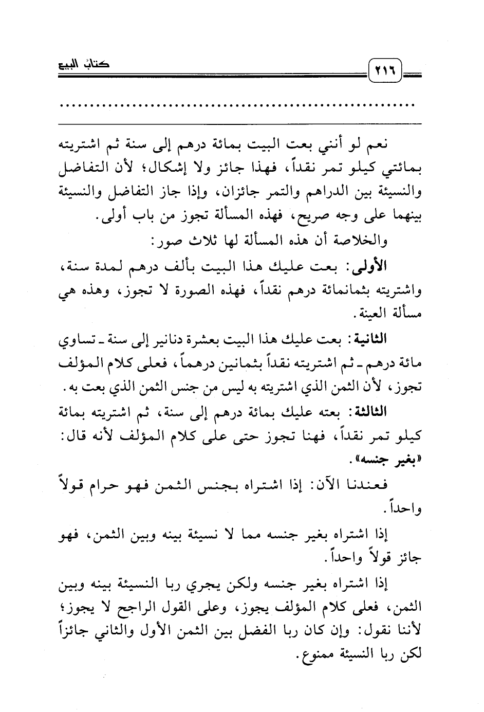 نعم لو أنني بعت البيت بمائة درهم إلى سنة ثم اشتريته بمائتي كيلو تمر نقداً، فهذا جائز ولا إشكال؛ لأن التفاضل والنسيئة بين الدراهم والتمر جائزان، وإذا جاز التفاضل والنسيئة بينهما على وجه صريح، فهذه المسألة تجوز من باب أولى.