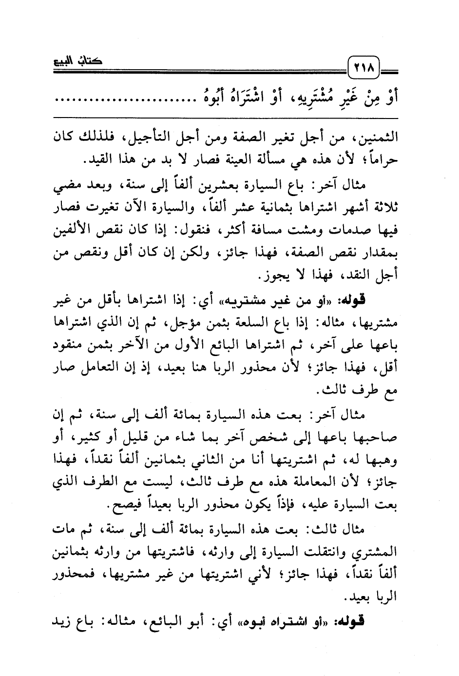 مثال آخر: بعت هذه السيارة بمائة ألف إلى سنة، ثم إن صاحبها باعها إلى شخص آخر بما شاء من قليل أو كثير، أو وهبها له، ثم اشتريتها أنا من الثاني بثمانين ألفاً نقداً، فهذا جائز؛ لأن المعاملة هذه مع طرف ثالث، ليست مع الطرف الذي بعت السيارة عليه، فإذاً يكون محذور الربا بعيداً فيصح.