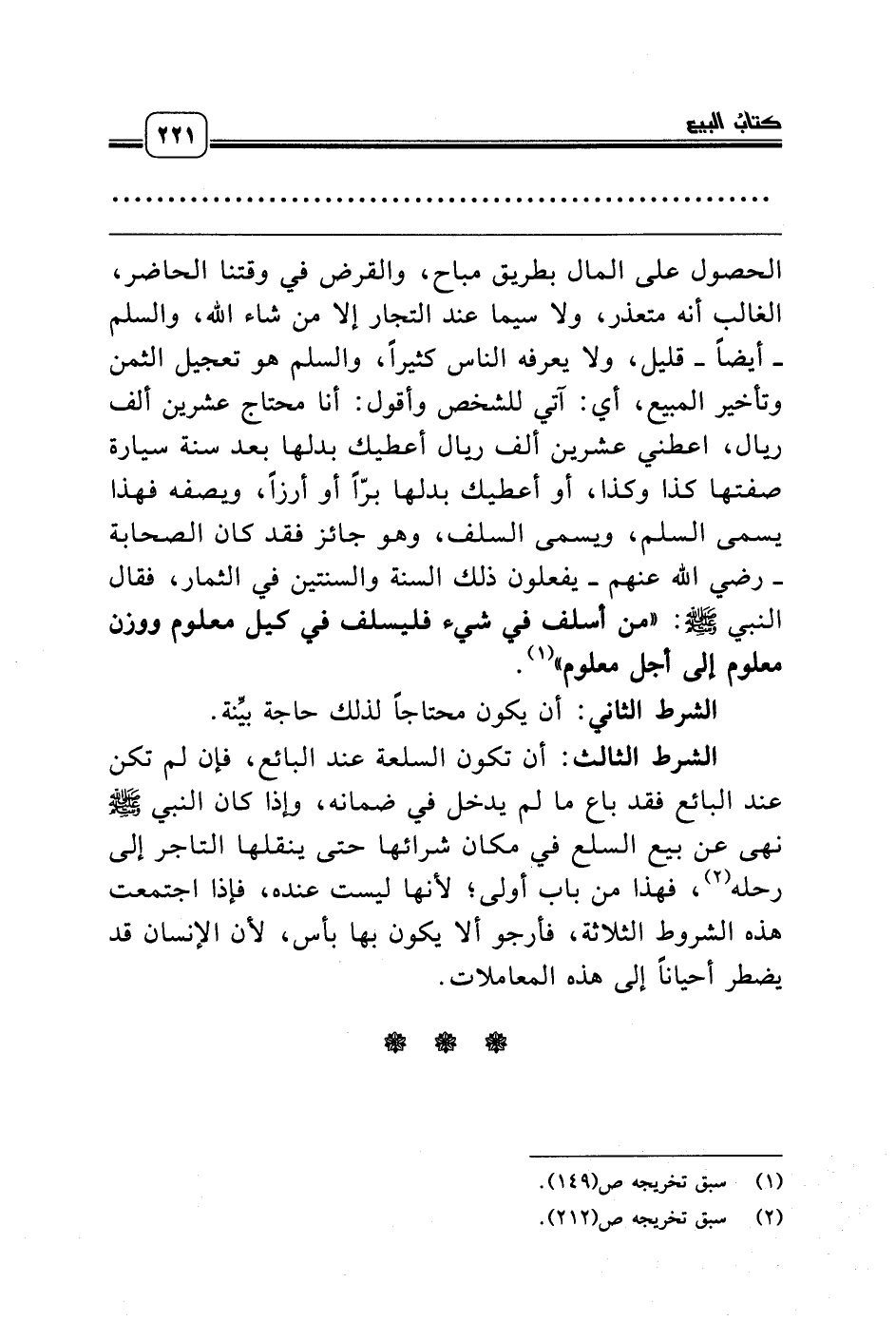 الحصول على المال بطريق مباح، والقرض في وقتنا الحاضر، الغالب أنه متعذر، ولا سيما عند التجار إلا من شاء الله، والسلم ـ أيضاً ـ قليل، ولا يعرفه الناس كثيراً، والسلم هو تعجيل الثمن وتأخير المبيع، أي: آتي للشخص وأقول: أنا محتاج عشرين ألف ريال، اعطني عشرين ألف ريال أعطيك بدلها بعد سنة سيارة صفتها كذا وكذا، أو أعطيك بدلها برّاً أو أرزاً، ويصفه فهذا يسمى السلم، ويسمى السلف، وهو جائز فقد كان الصحابة ـ رضي الله عنهم ـ يفعلون ذلك السنة والسنتين في الثمار، فقال النبي صلّى الله عليه وسلّم: «من أسلف في شيء فليسلف في كيل معلوم ووزن معلوم إلى أجل معلوم» (¬1).