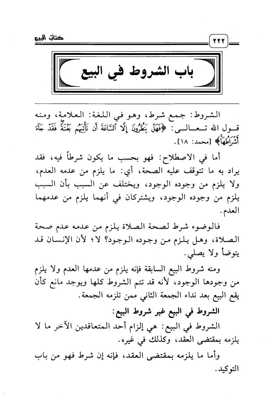 الشروط في البيع: هي إلزام أحد المتعاقدين الآخر ما لا يلزمه بمقتضى العقد، وكذلك في غيره.