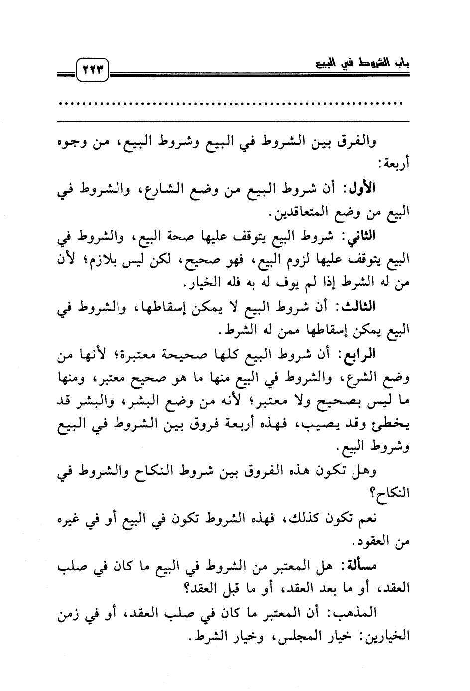 الرابع: أن شروط البيع كلها صحيحة معتبرة؛ لأنها من وضع الشرع، والشروط في البيع منها ما هو صحيح معتبر، ومنها ما ليس بصحيح ولا معتبر؛ لأنه من وضع البشر، والبشر قد يخطئ وقد يصيب، فهذه أربعة فروق بين الشروط في البيع وشروط البيع.