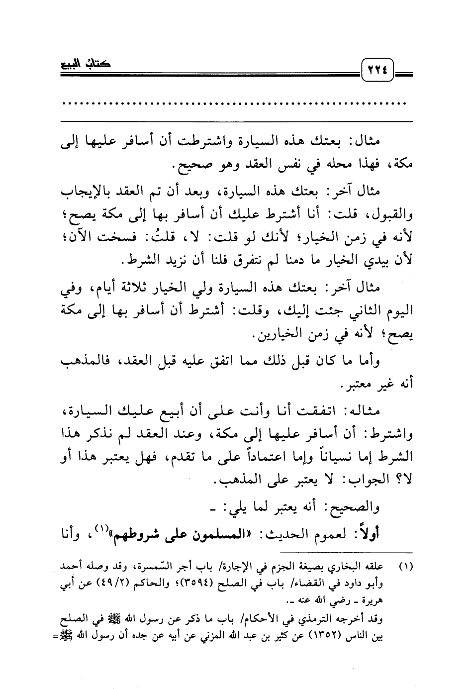 مثال آخر: بعتك هذه السيارة، وبعد أن تم العقد بالإيجاب والقبول، قلت: أنا أشترط عليك أن أسافر بها إلى مكة يصح؛ لأنه في زمن الخيار؛ لأنك لو قلت: لا، قلتُ: فسخت الآن؛ لأن بيدي الخيار ما دمنا لم نتفرق فلنا أن نزيد الشرط.
