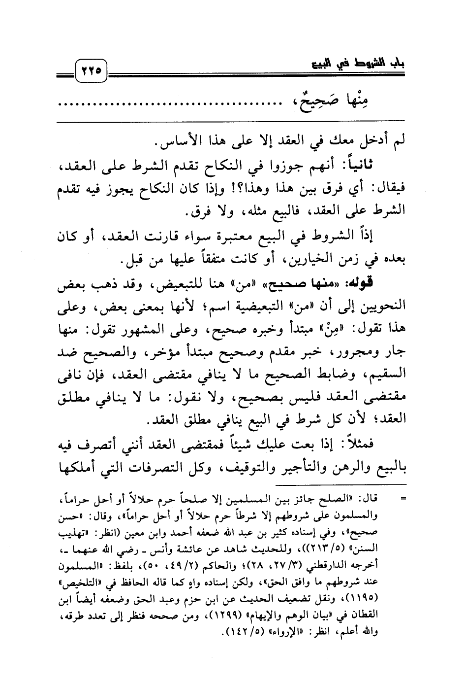 قوله: «منها صحيح» «من» هنا للتبعيض، وقد ذهب بعض النحويين إلى أن «من» التبعيضية اسم؛ لأنها بمعنى بعض، وعلى هذا تقول: «مِنْ» مبتدأ وخبره صحيح، وعلى المشهور تقول: منها جار ومجرور، خبر مقدم وصحيح مبتدأ مؤخر، والصحيح ضد السقيم، وضابط الصحيح ما لا ينافي مقتضى العقد، فإن نافى مقتضى العقد فليس بصحيح، ولا نقول: ما لا ينافي مطلق العقد؛ لأن كل شرط في البيع ينافي مطلق العقد.