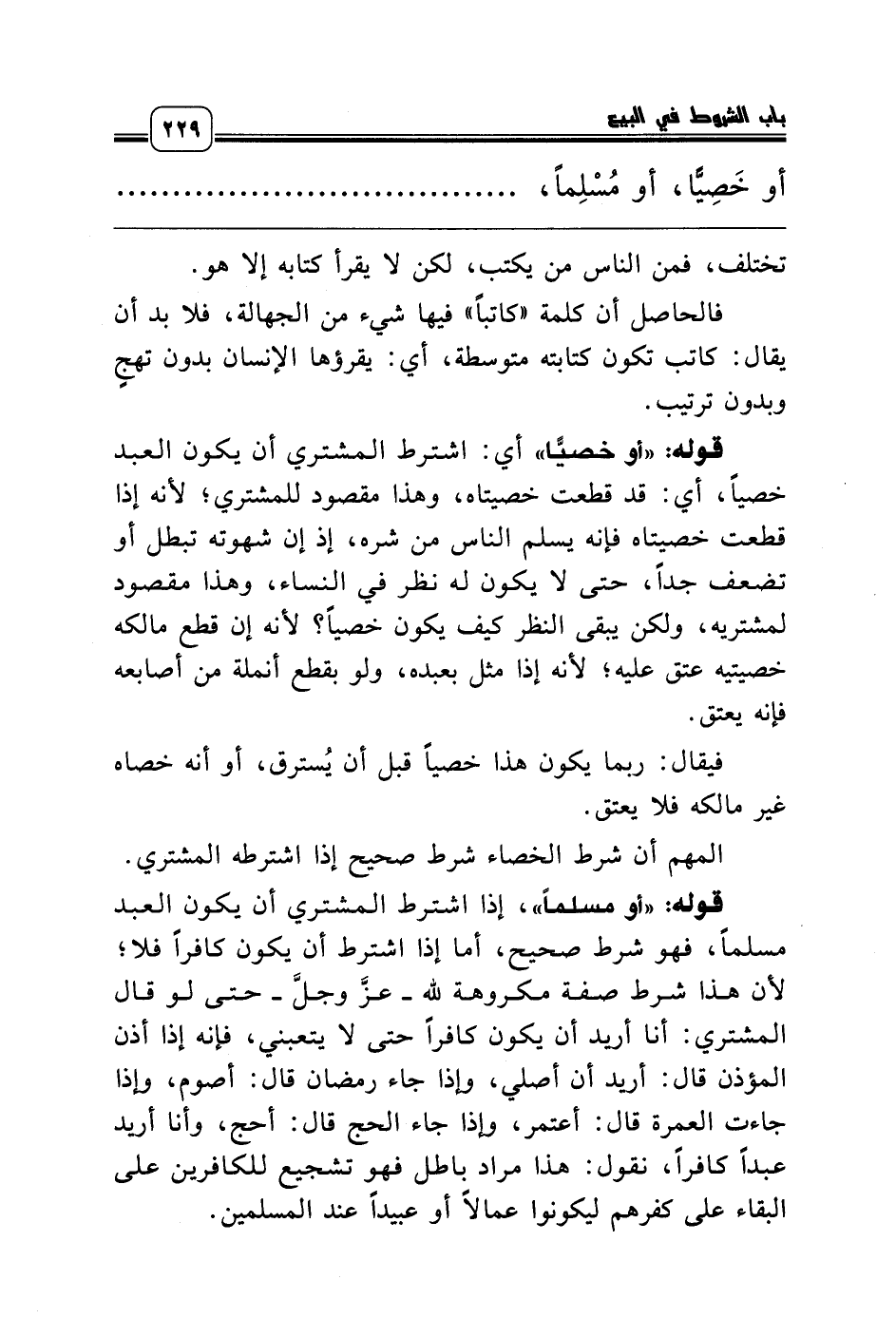 قوله: «أو مسلماً»، إذا اشترط المشتري أن يكون العبد مسلماً، فهو شرط صحيح، أما إذا اشترط أن يكون كافراً فلا؛ لأن هذا شرط صفة مكروهة لله ـ عزّ وجل ـ حتى لو قال المشتري: أنا أريد أن يكون كافراً حتى لا يتعبني، فإنه إذا أذن المؤذن قال: أريد أن أصلي، وإذا جاء رمضان قال: أصوم، وإذا جاءت العمرة قال: أعتمر، وإذا جاء الحج قال: أحج، وأنا أريد عبداً كافراً، نقول: هذا مراد باطل فهو تشجيع للكافرين على البقاء على كفرهم ليكونوا عمالاً أو عبيداً عند المسلمين.