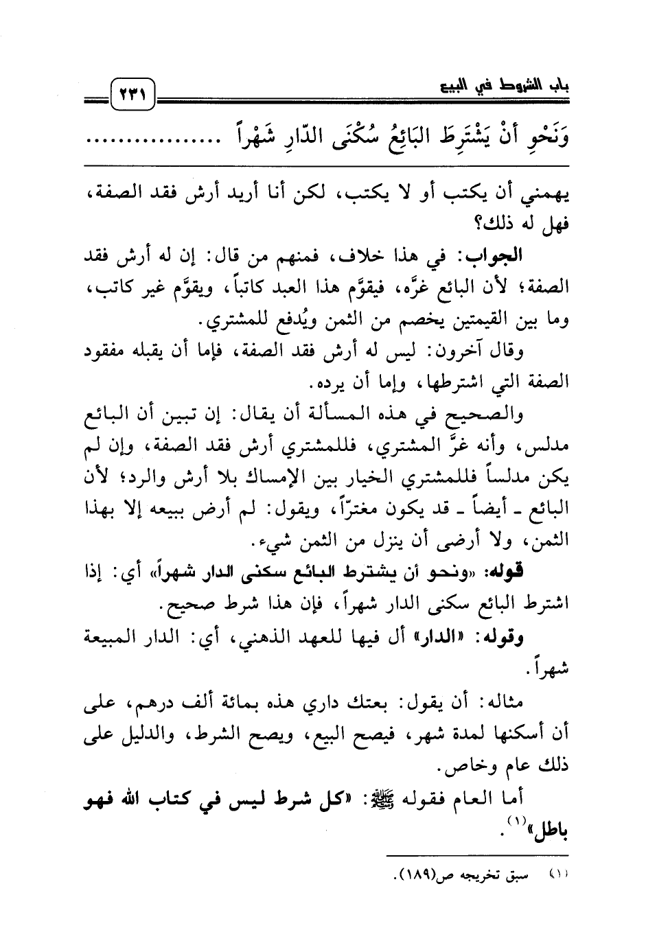 وَنَحْوِ أنْ يَشْتَرِطَ البَائِعُ سُكْنَى الدّارِ شَهْراً وَحُمْلاَنَ البَعِيْرِ إلَى مَوْضِعٍ مُعَيَّنٍ، أو شَرَطَ المُشْتَرِي عَلَى البَائِع حَمْلَ الحَطَبِ، أو تَكْسِيْرَه، أو خِيَاطَةَ الثّوْبِ، أَوْ تَفْصِيْلَهُ، ..