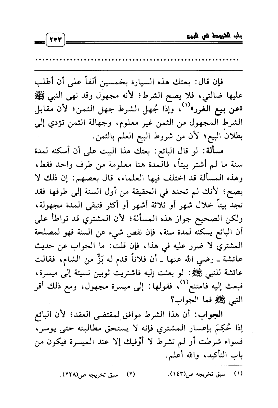 مسألة: لو قال البائع: بعتك هذا البيت على أن أسكنه لمدة سنة ما لم أشتر بيتاً، فالمدة هنا معلومة من طرف واحد فقط، وهذه المسألة قد اختلف فيها العلماء، قال بعضهم: إن ذلك لا يصح؛ لأنك لم تحدد في الحقيقة من أول السنة إلى طرفها فقد تجد بيتاً خلال شهر أو ثلاثة أشهر أو أكثر فتبقى المدة مجهولة، ولكن الصحيح جواز هذه المسألة؛ لأن المشتري قد تواطأ على أن البائع يسكنه لمدة سنة، فإن نقص شيء عن السنة فهو لمصلحة المشتري لا ضرر عليه في هذا، فإن قلت: ما الجواب عن حديث عائشة ـ رضي الله عنها ـ أن فلاناً قدم له بَزٌّ من الشام، فقالت عائشة للنبي صلّى الله عليه وسلّم: لو بعثت إليه فاشتريت ثوبين نسيئة إلى ميسرة، فبعث إليه فامتنع (¬2)، فقولها: إلى ميسرة مجهول، ومع ذلك أقر النبي صلّى الله عليه وسلّم فما الجواب؟