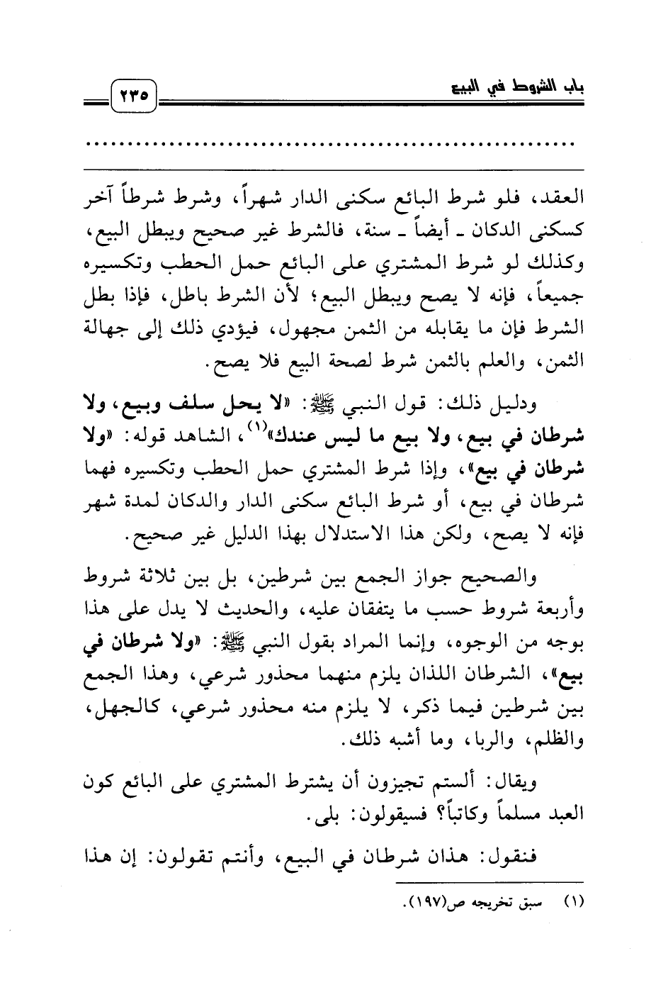والصحيح جواز الجمع بين شرطين، بل بين ثلاثة شروط وأربعة شروط حسب ما يتفقان عليه، والحديث لا يدل على هذا بوجه من الوجوه، وإنما المراد بقول النبي صلّى الله عليه وسلّم: «ولا شرطان في بيع»، الشرطان اللذان يلزم منهما محذور شرعي، وهذا الجمع بين شرطين فيما ذكر، لا يلزم منه محذور شرعي، كالجهل، والظلم، والربا، وما أشبه ذلك.