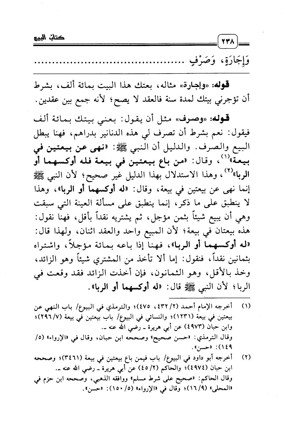 قوله: «وصرف» مثل أن يقول: بعني بيتك بمائة ألف فيقول: نعم بشرط أن تصرف لي هذه الدنانير بدراهم، فهنا يبطل البيع والصرف. والدليل أن النبي صلّى الله عليه وسلّم: «نهى عن بيعتين في بيعة» (¬1)، وقال: «من باع بيعتين في بيعة فله أوكسهما أو الربا» (¬2)، وهذا الاستدلال بهذا الدليل غير صحيح؛ لأن النبي صلّى الله عليه وسلّم إنما نهى عن بيعتين في بيعة، وقال: «له أوكسهما أو الربا»، وهذا لا ينطبق على ما ذكر، إنما ينطبق على مسألة العينة التي سبقت وهي أن يبيع شيئاً بثمن مؤجل، ثم يشتريه نقداً بأقل، فهنا نقول: هذه بيعتان في بيعة؛ لأن المبيع واحد والعقد اثنان، ولهذا قال: «له أوكسهما أو الربا»، فهنا إذا باعه بمائة مؤجلاً، واشتراه بثمانين نقداً، فنقول: إما ألا تأخذ من المشتري شيئاً وهو الزائد، وخذ بالأقل، وهو الثمانون، فإن أخذت الزائد فقد وقعت في الربا؛ لأن النبي صلّى الله عليه وسلّم قال: «له أوكسهما أو الربا».