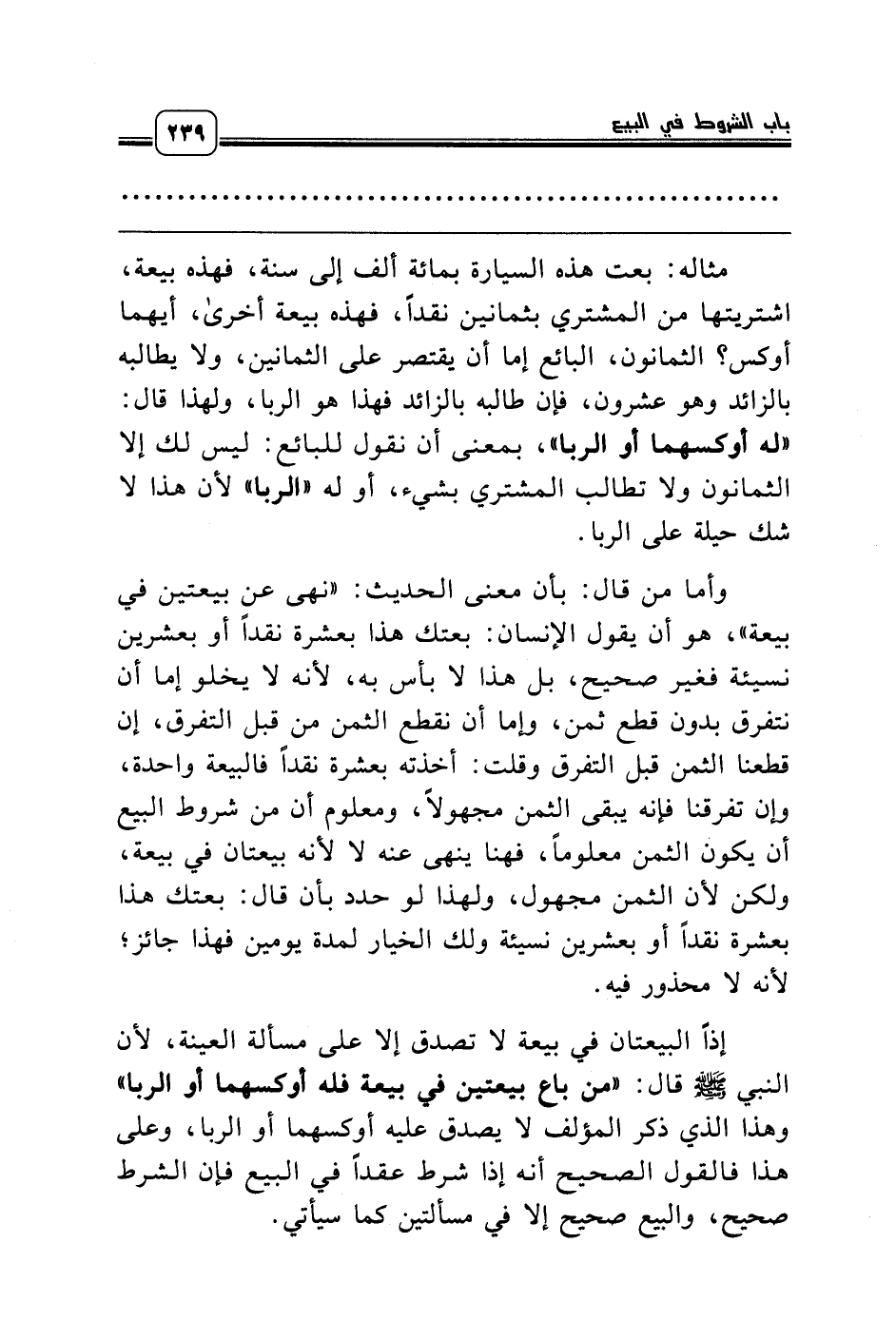 مثاله: بعت هذه السيارة بمائة ألف إلى سنة، فهذه بيعة، اشتريتها من المشتري بثمانين نقداً، فهذه بيعة أخرى، أيهما أوكس؟ الثمانون، البائع إما أن يقتصر على الثمانين، ولا يطالبه بالزائد وهو عشرون، فإن طالبه بالزائد فهذا هو الربا، ولهذا قال: «له أوكسهما أو الربا»، بمعنى أن نقول للبائع: ليس لك إلا الثمانون ولا تطالب المشتري بشيء، أو له «الربا» لأن هذا لا شك حيلة على الربا.