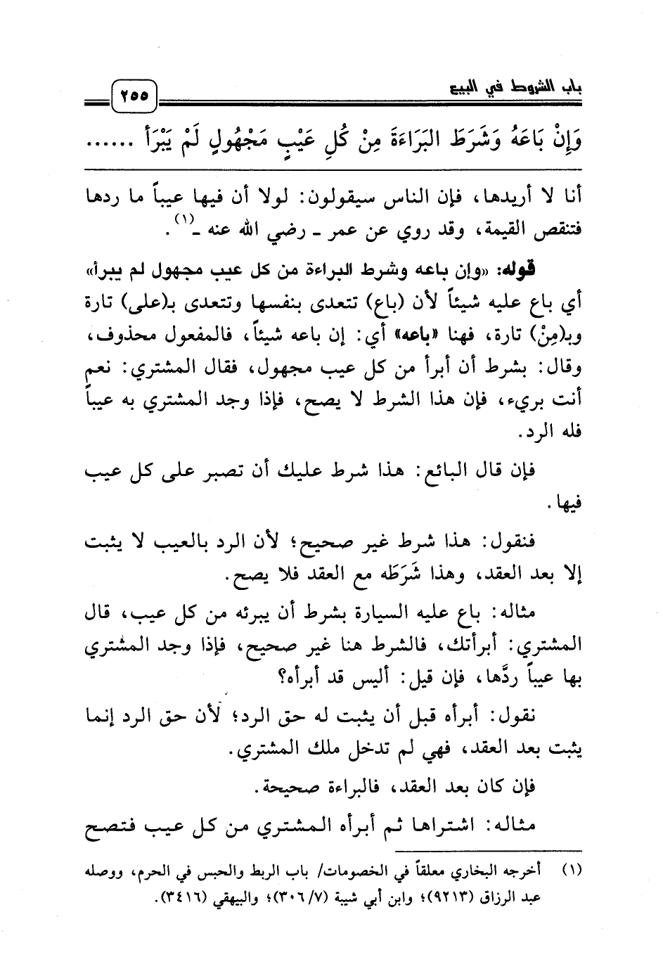 قوله: «وإن باعه وشرط البراءة من كل عيب مجهول لم يبرأ» أي باع عليه شيئاً لأن (باع) تتعدى بنفسها وتتعدى بـ (على) تارة وبـ (مِنْ) تارة، فهنا «باعه» أي: إن باعه شيئاً، فالمفعول محذوف، وقال: بشرط أن أبرأ من كل عيب مجهول، فقال المشتري: نعم أنت بريء، فإن هذا الشرط لا يصح، فإذا وجد المشتري به عيباً فله الرد.