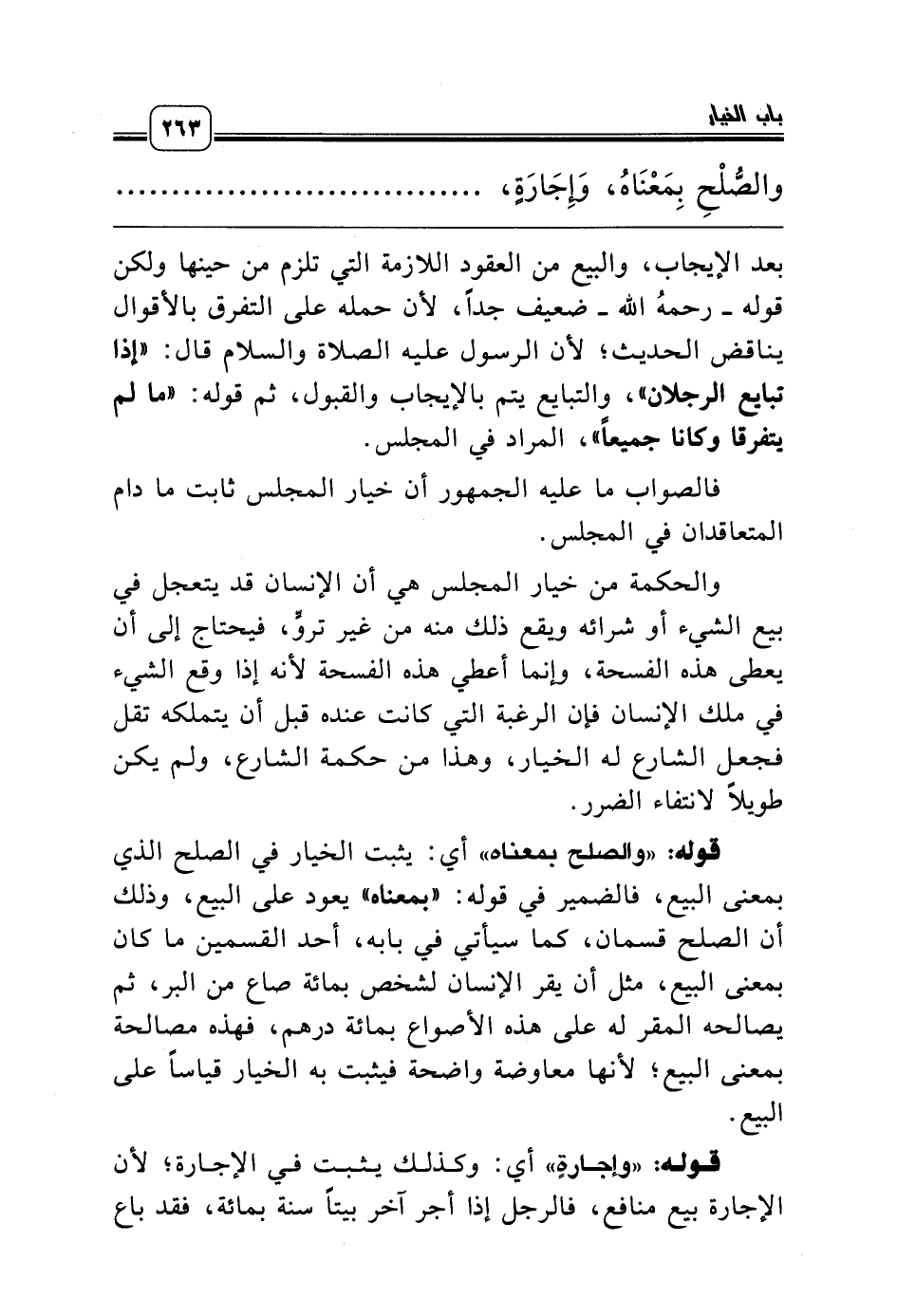 قوله: «والصلح بمعناه» أي: يثبت الخيار في الصلح الذي بمعنى البيع، فالضمير في قوله: «بمعناه» يعود على البيع، وذلك أن الصلح قسمان، كما سيأتي في بابه، أحد القسمين ما كان بمعنى البيع، مثل أن يقر الإنسان لشخص بمائة صاع من البر، ثم يصالحه المقر له على هذه الأصواع بمائة درهم، فهذه مصالحة بمعنى البيع؛ لأنها معاوضة واضحة فيثبت به الخيار قياساً على البيع.