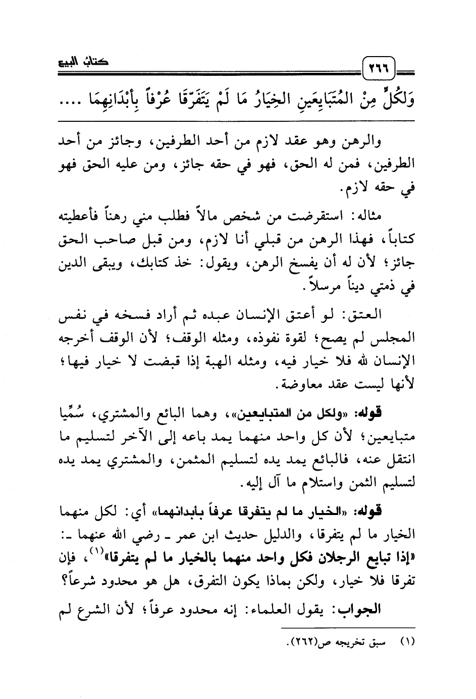 وَلكُلٍّ مِنْ المُتَبَايِعَينِ الخِيَارُ مَا لَمْ يَتَفَرّقَا عُرْفاً بِأبْدَانِهِمَا وَإِنْ نَفَيَاهُ أَوْ أسْقَطَاهُ سَقَطَ وَإِنْ أسْقَطَهُ أحَدُهُمَا بَقِي خِيَارُ الآخَرِ، ......