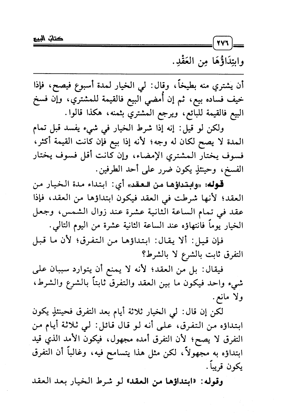 قوله: «وابتداؤها من العقد» أي: ابتداء مدة الخيار من العقد؛ لأنها شرطت في العقد فيكون ابتداؤها من العقد، فإذا عقد في تمام الساعة الثانية عشرة عند زوال الشمس، وجعل الخيار يوماً فانتهاؤه عند الساعة الثانية عشرة من اليوم التالي.