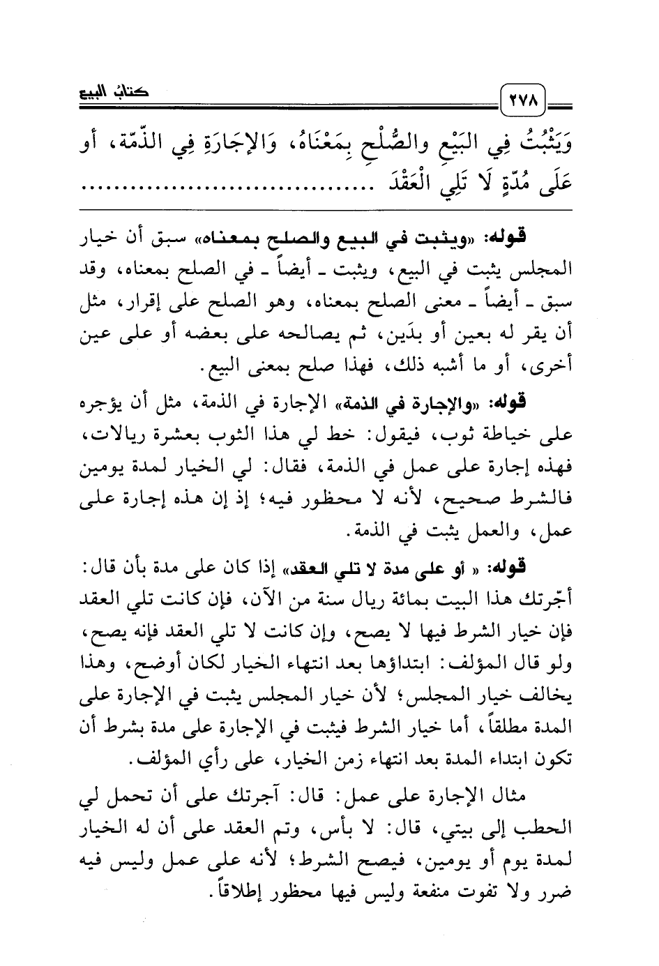 قوله: «والإجارة في الذمة» الإجارة في الذمة، مثل أن يؤجره على خياطة ثوب، فيقول: خط لي هذا الثوب بعشرة ريالات، فهذه إجارة على عمل في الذمة، فقال: لي الخيار لمدة يومين فالشرط صحيح، لأنه لا محظور فيه؛ إذ إن هذه إجارة على عمل، والعمل يثبت في الذمة.