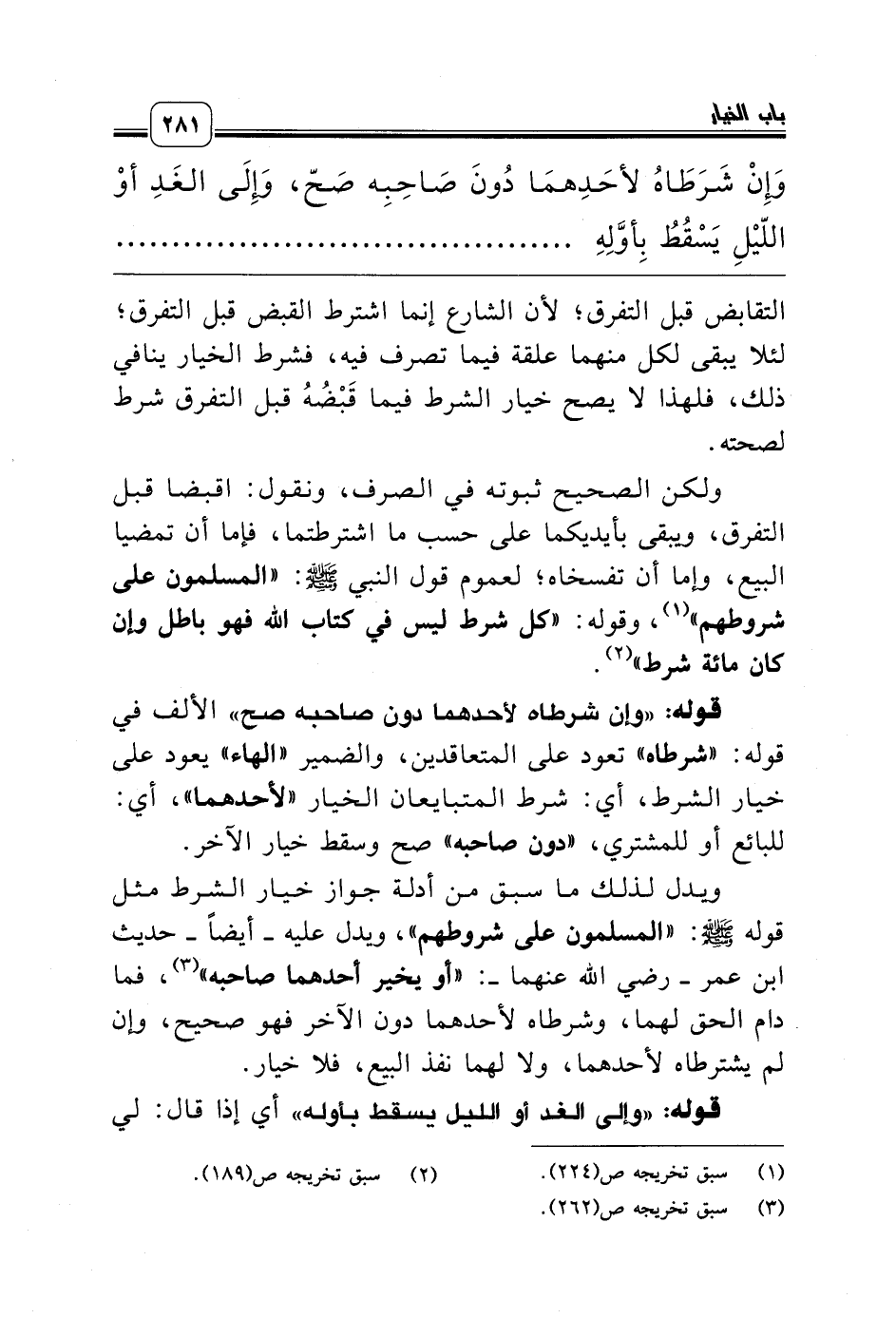 ولكن الصحيح ثبوته في الصرف، ونقول: اقبضا قبل التفرق، ويبقى بأيديكما على حسب ما اشترطتما، فإما أن تمضيا البيع، وإما أن تفسخاه؛ لعموم قول النبي صلّى الله عليه وسلّم: «المسلمون على شروطهم» (¬1)، وقوله: «كل شرط ليس في كتاب الله فهو باطل وإن كان مائة شرط» (¬2).