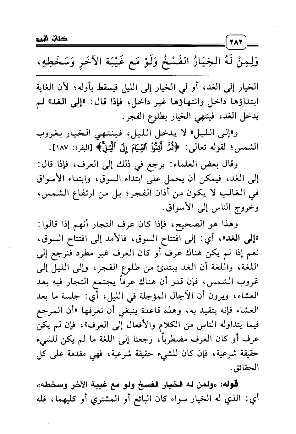 وهذا هو الصحيح، فإذا كان عرف التجار أنهم إذا قالوا: «إلى الغد»، أي: إلى افتتاح السوق، فالأمد إلى افتتاح السوق، نعم إذا لم يكن هناك عرف أو كان العرف غير مطرد فنرجع إلى اللغة، واللغة أن الغد يبتدئ من طلوع الفجر، وإلى الليل إلى غروب الشمس، فإن قدر أن هناك عرفاً يجتمع التجار فيه بعد العشاء، ويرون أن الآجال المؤجلة في الليل، أي: جلسة ما بعد العشاء فإنه يتقيد به، وهذه قاعدة ينبغي أن نعرفها «أن المرجع فيما يتداوله الناس من الكلام والأفعال إلى العرف»، فإن لم يكن عرف أو كان العرف مضطرباً، رجعنا إلى اللغة ما لم يكن للشيء حقيقة شرعية، فإن كان للشيء حقيقة شرعية، فهي مقدمة على كل الحقائق.